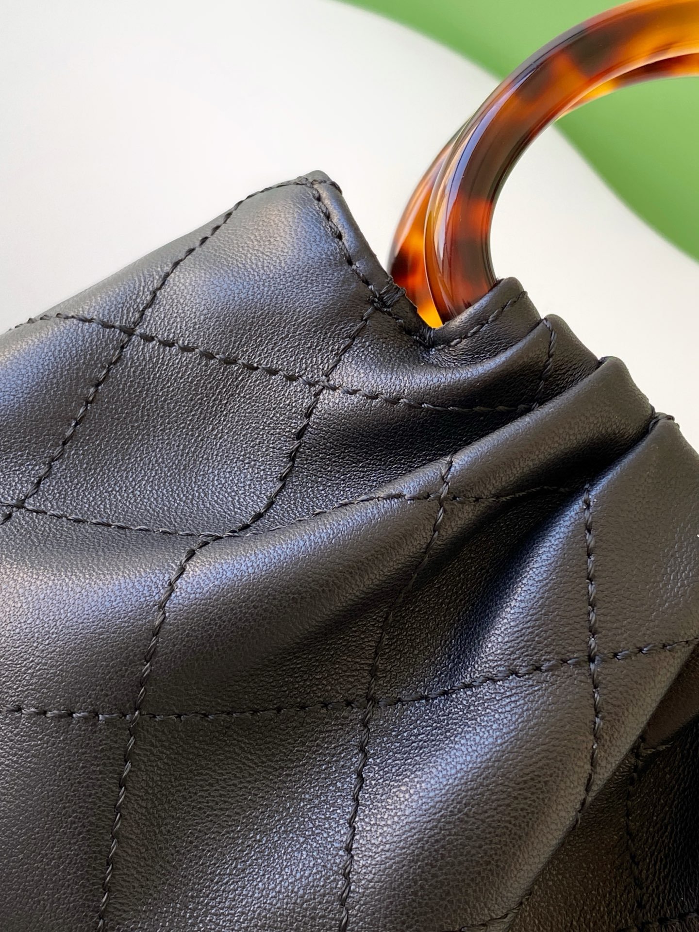 • Material: Premium smooth lambskin with a buttery-soft texture, paired with tortoiseshell-effect acrylic (resin composite) handle and logo hardware.