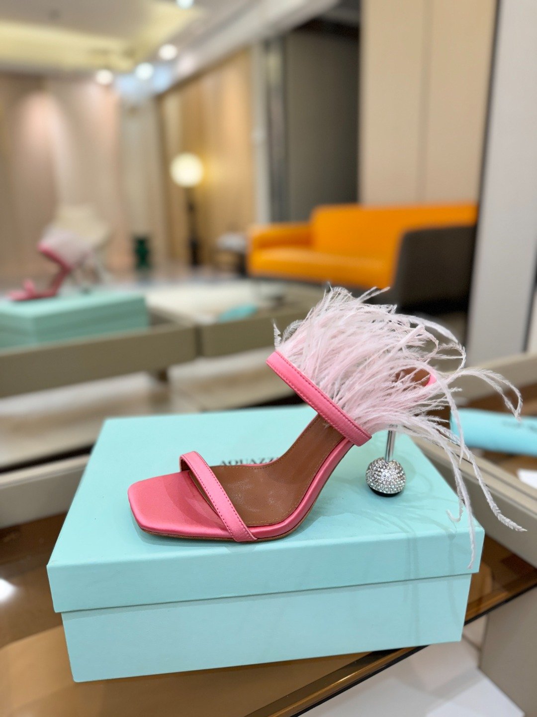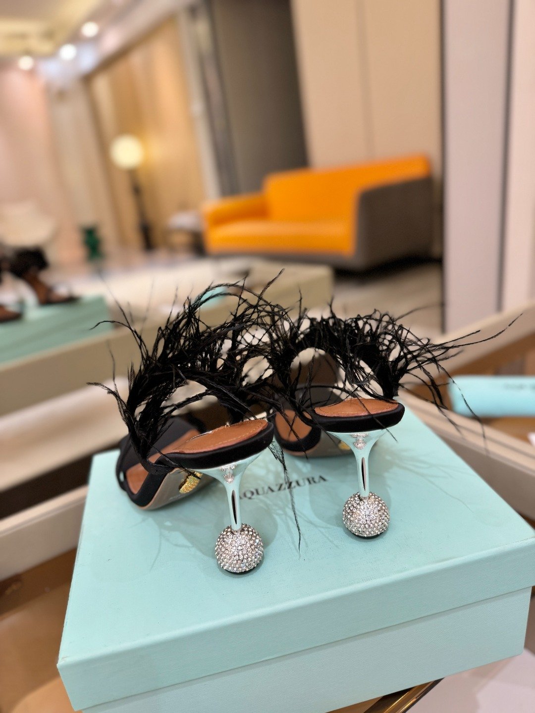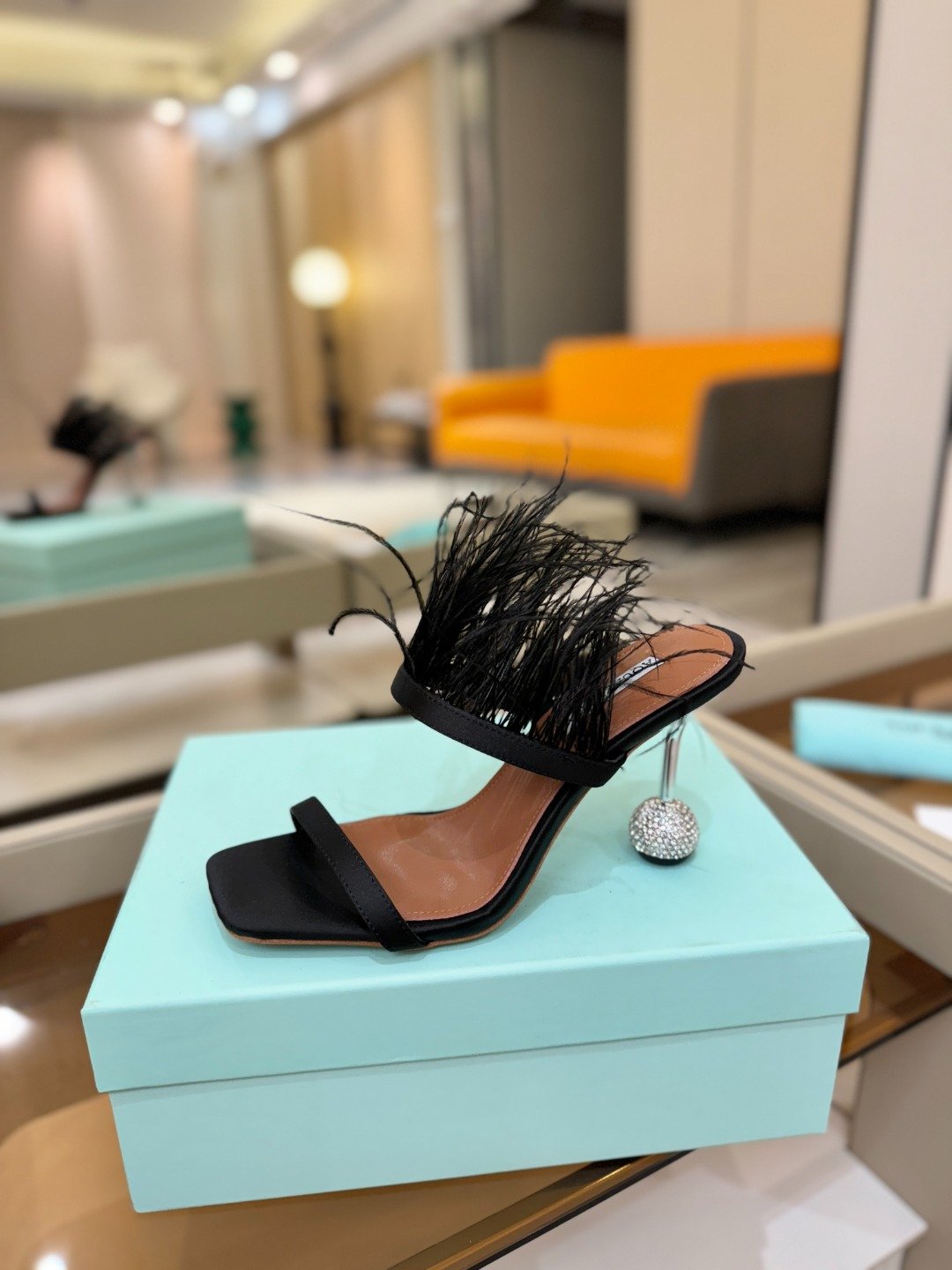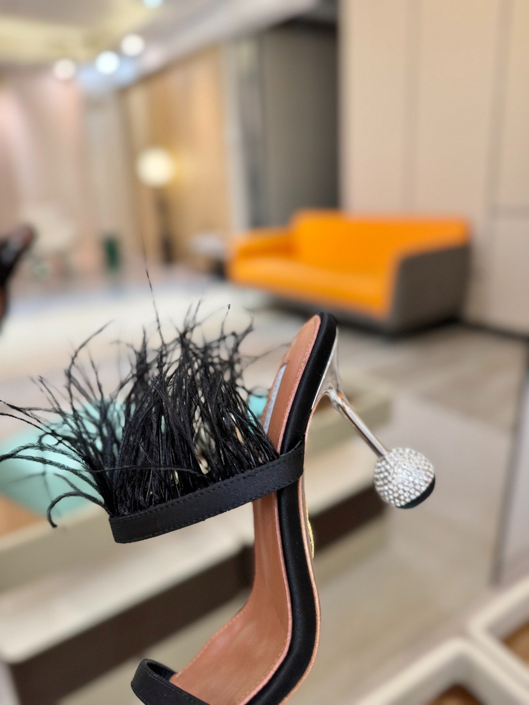 - Material: Satin upper with ostrich feather embellishment, spherical crystal-encrusted heel, leather lining and insole