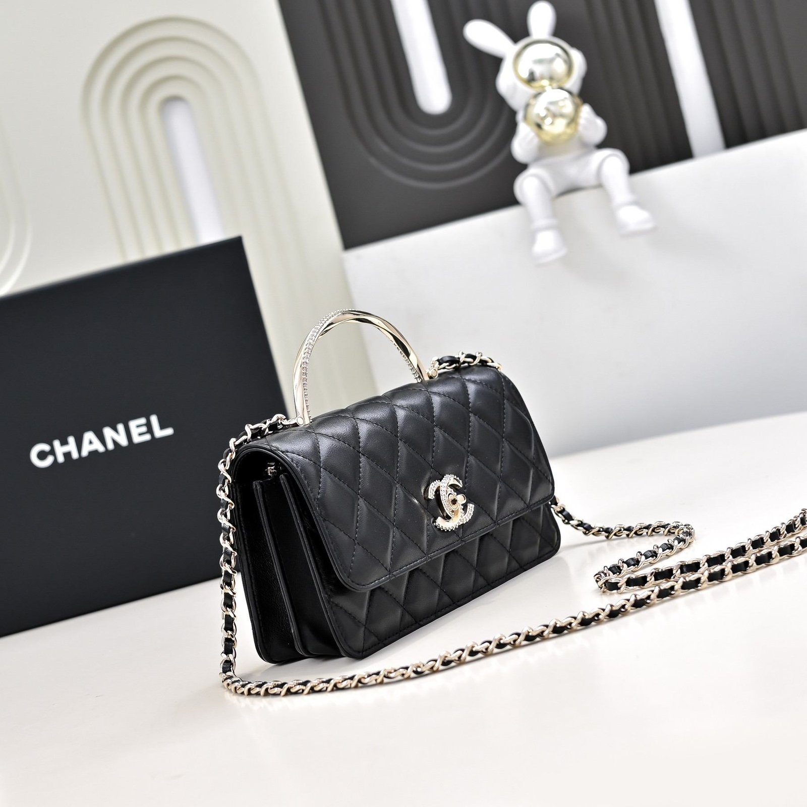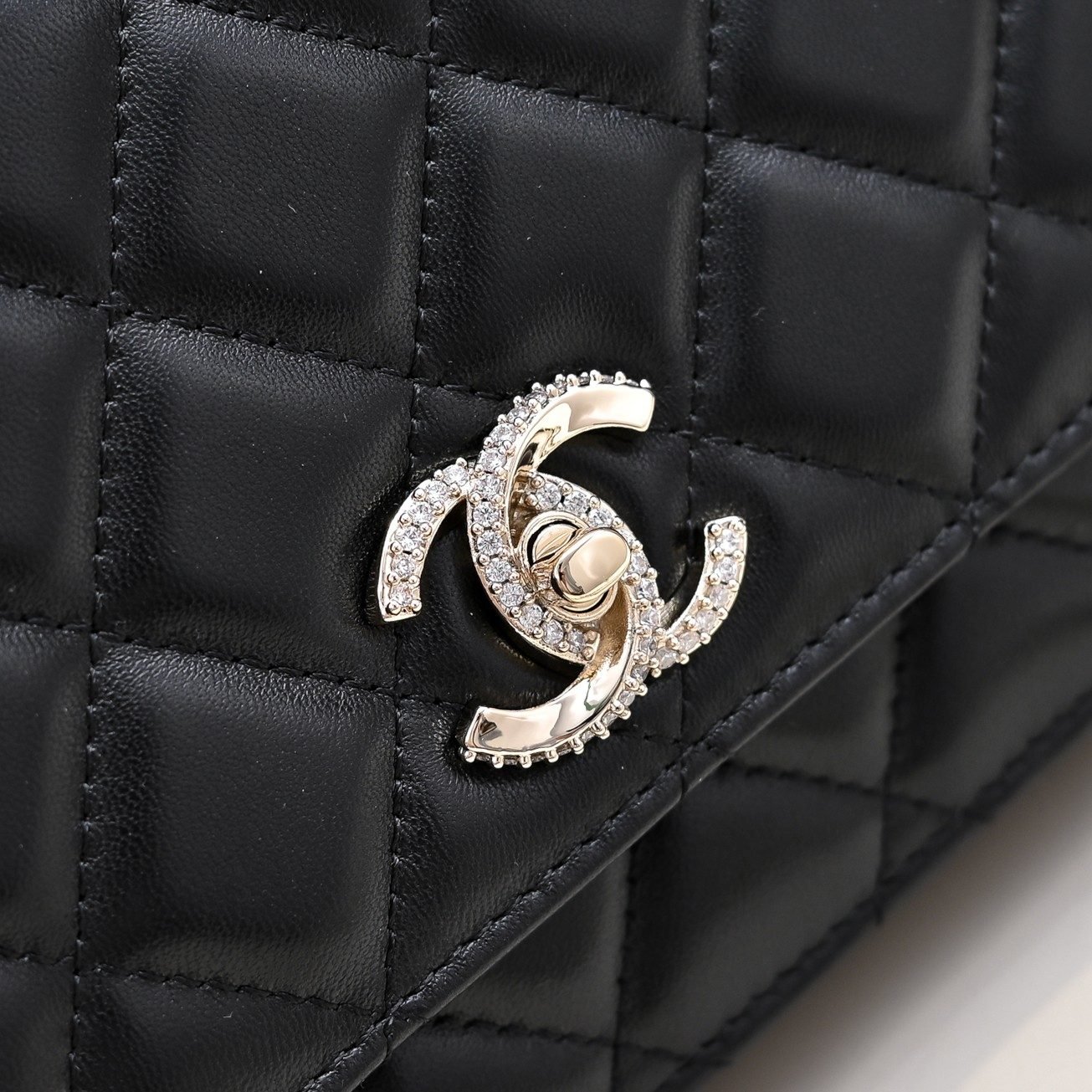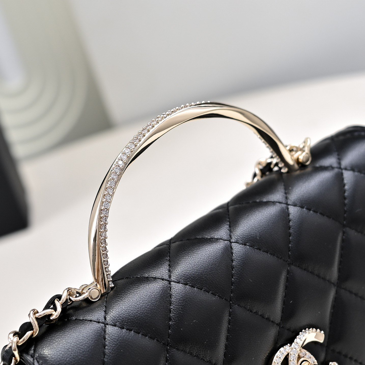 - Material: Premium lambskin with iconic diamond quilting, paired with a spiral crystal-embellished top handle, crystal-encrusted interlocking CC turnlock hardware, and full leather lining