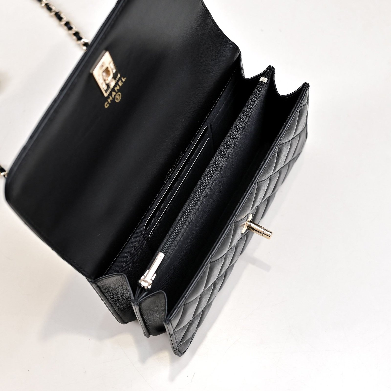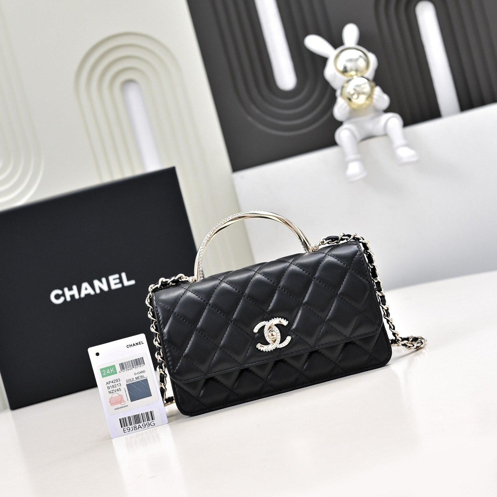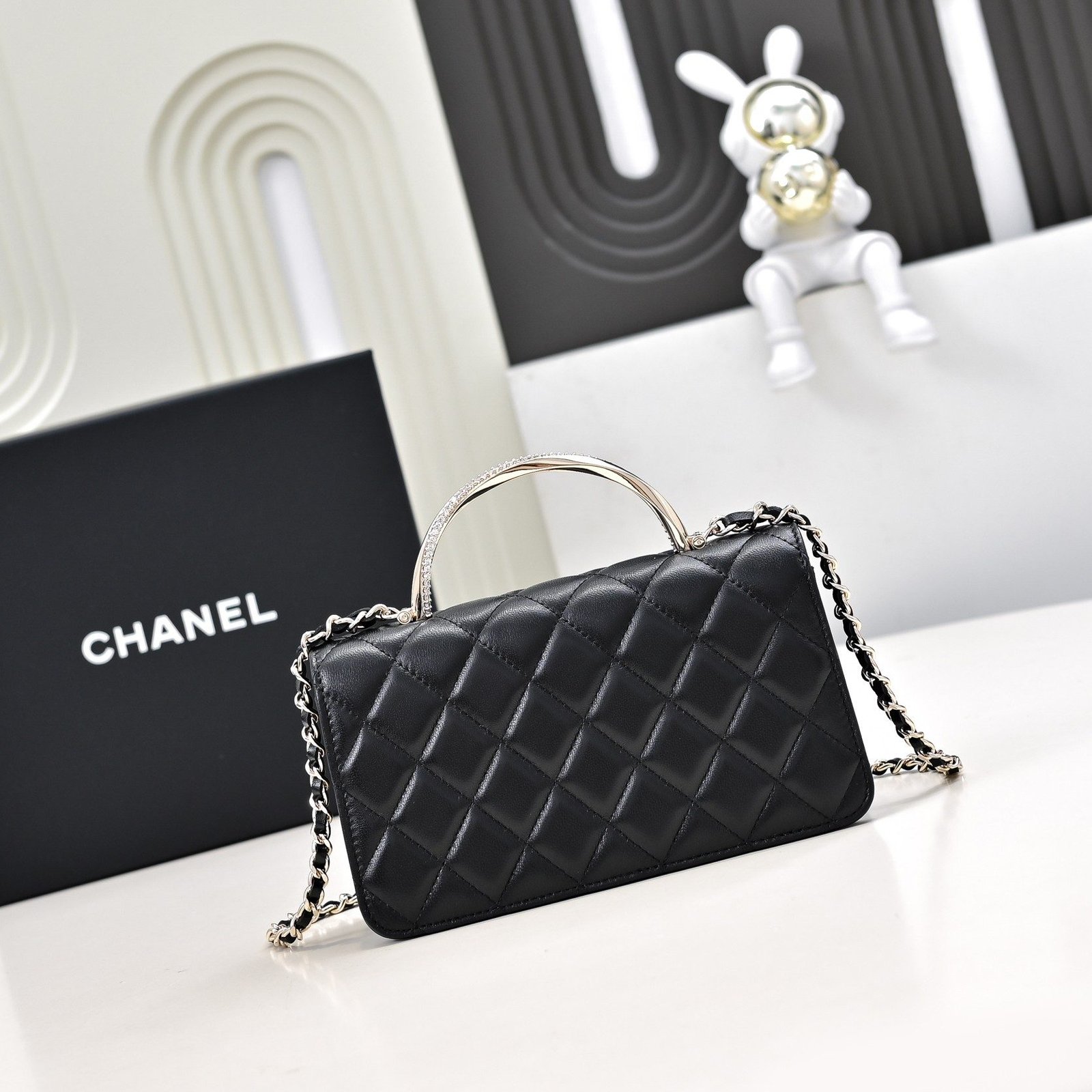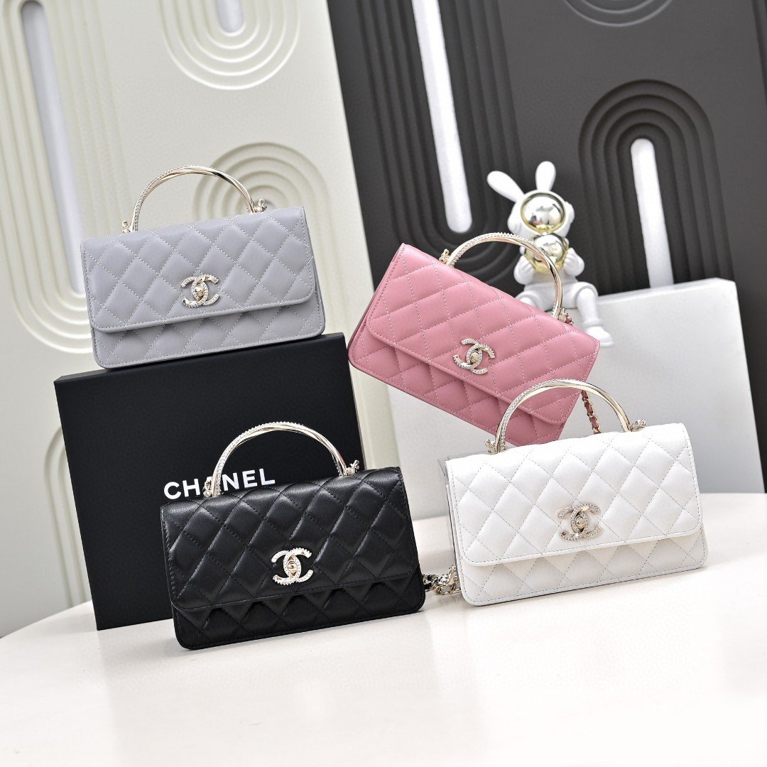 - Material: Premium lambskin with iconic diamond quilting, paired with a spiral crystal-embellished top handle, crystal-encrusted interlocking CC turnlock hardware, and full leather lining