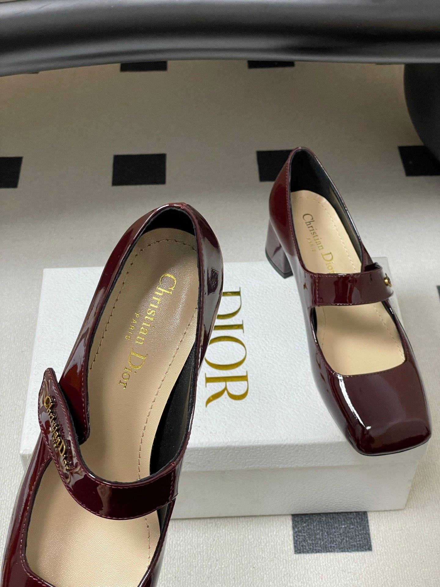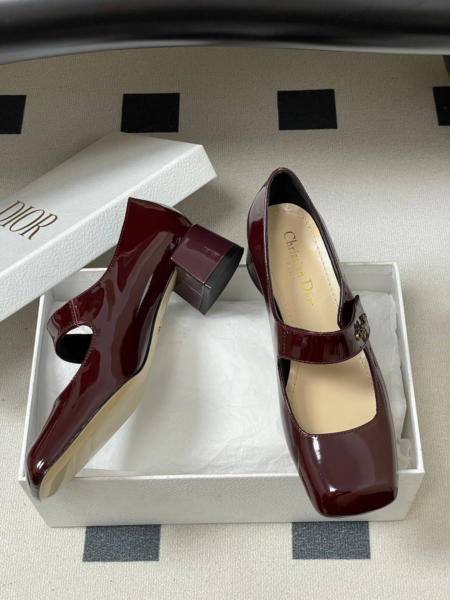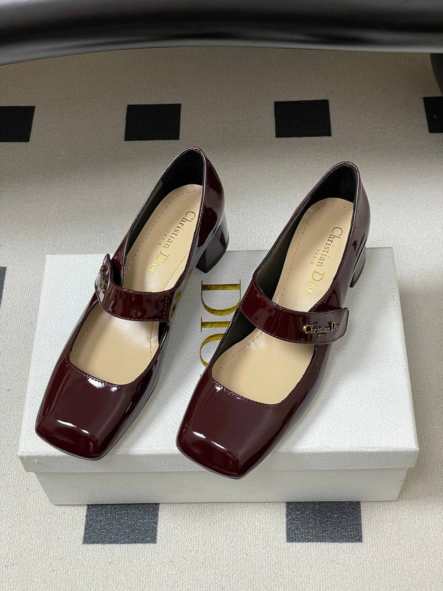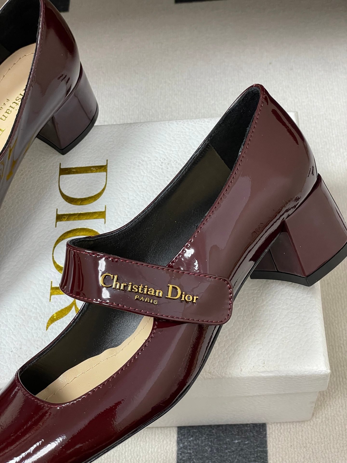- Material: Burgundy patent calfskin leather upper with gold-tone “Christian Dior Paris” logo-embellished Mary Jane strap, leather lining and insole, block heel