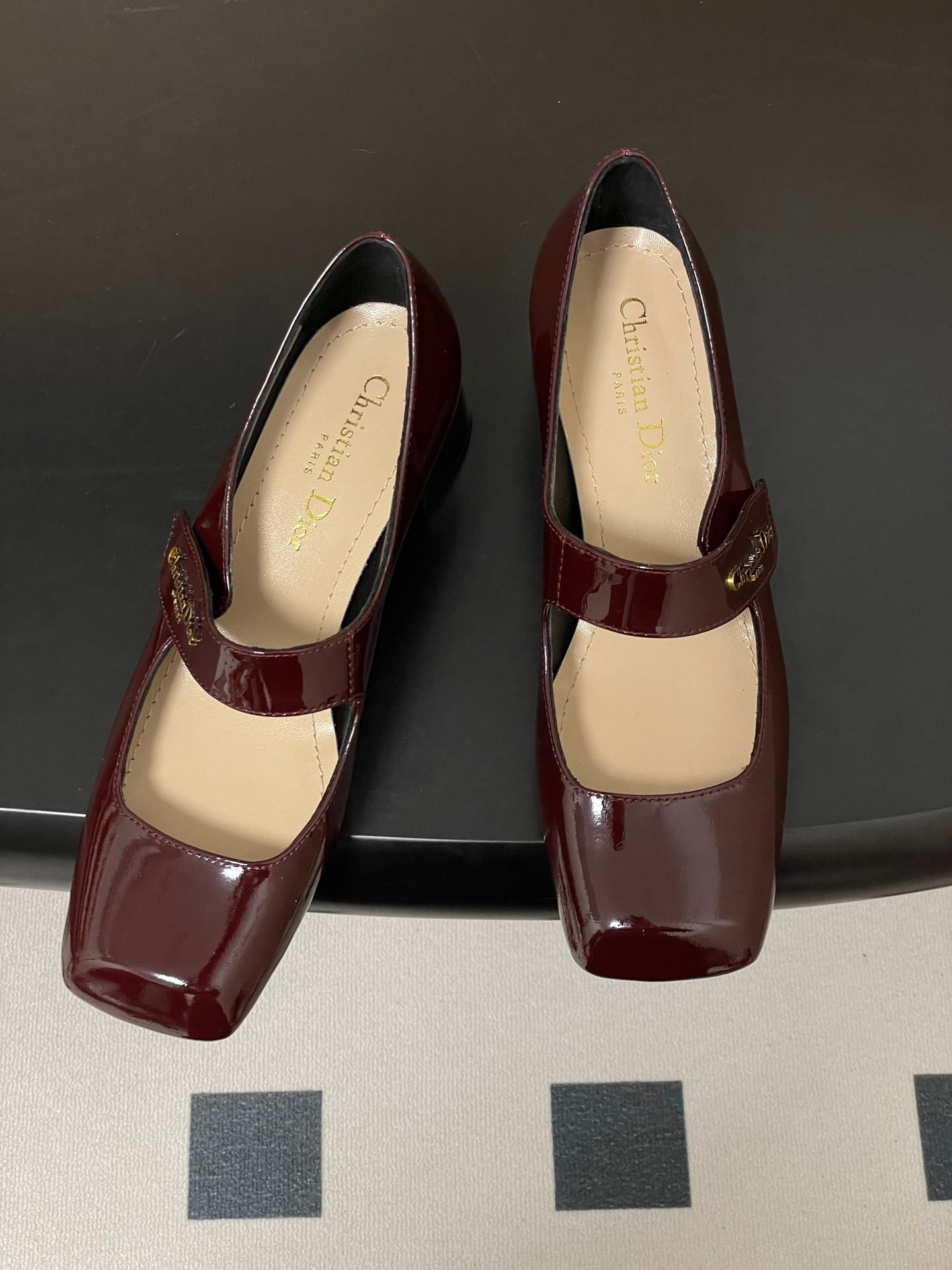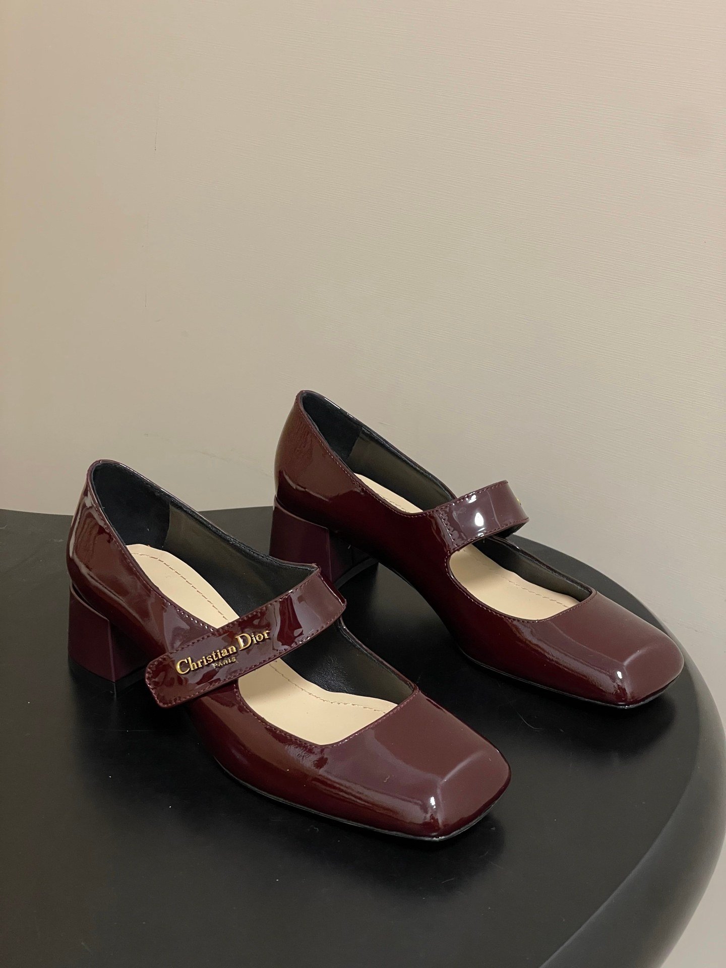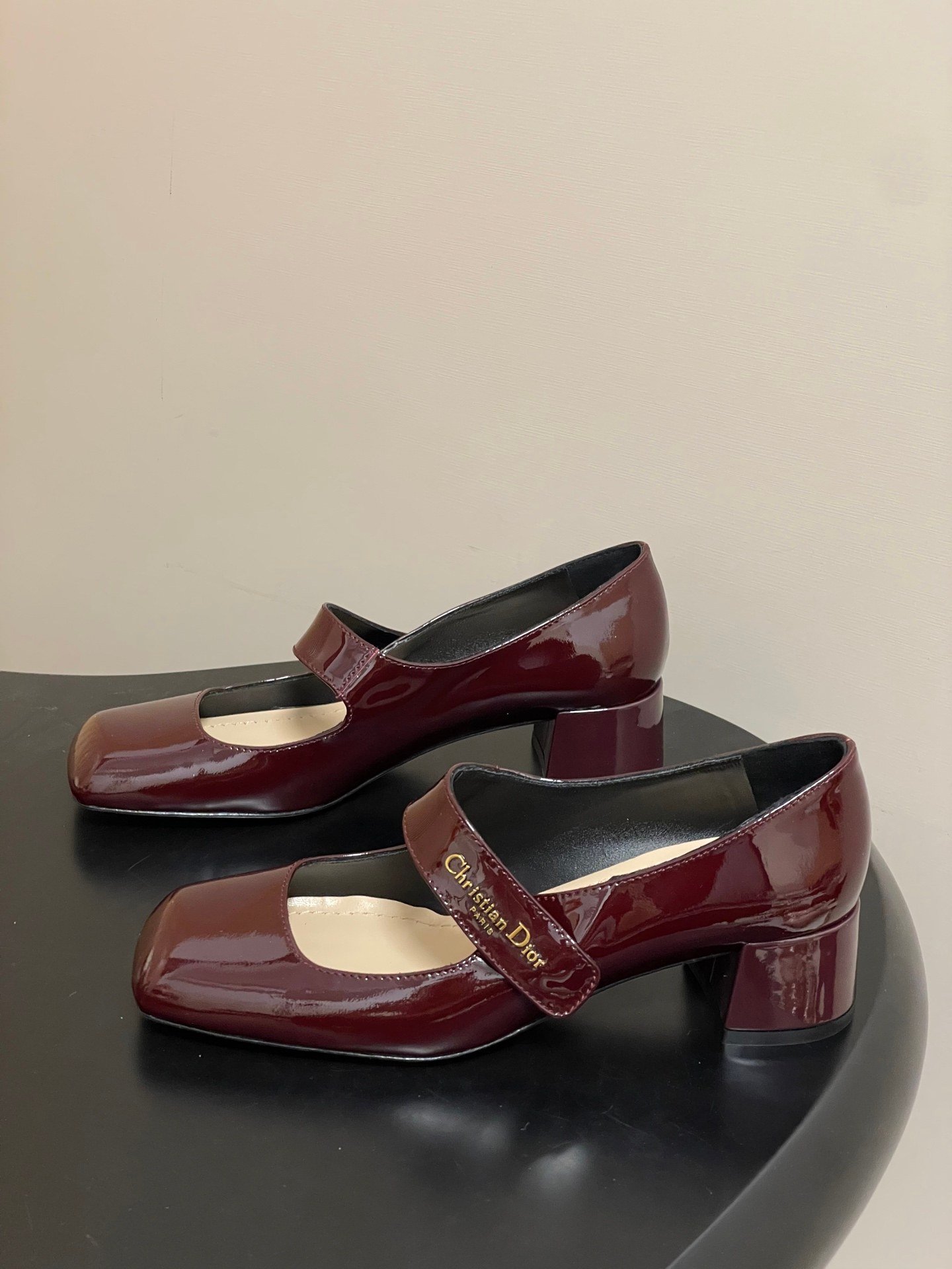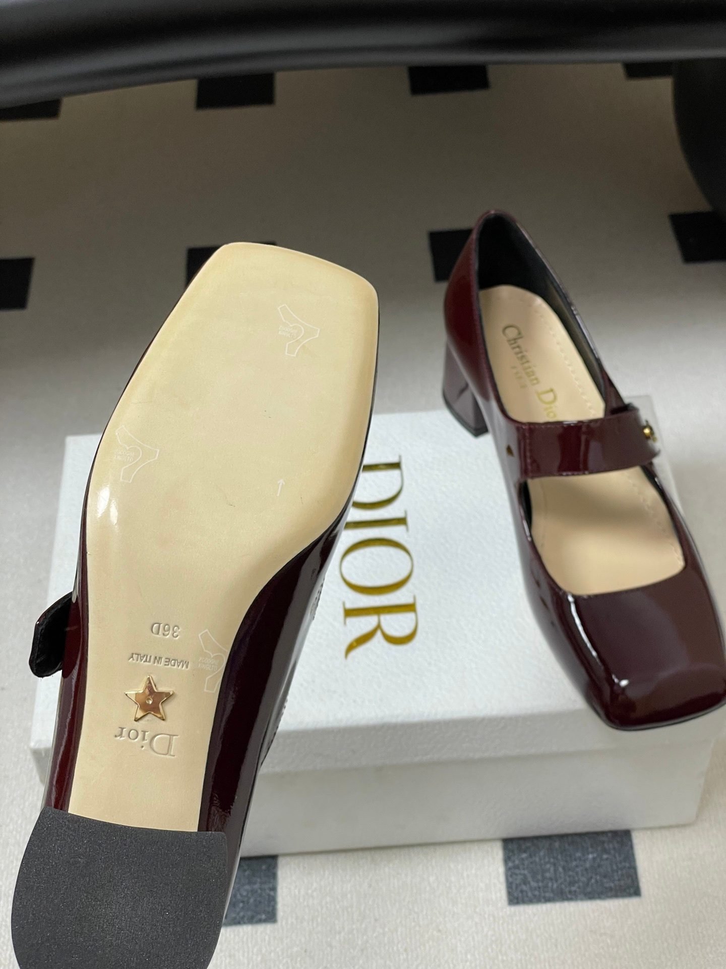 - Material: Burgundy patent calfskin leather upper with gold-tone “Christian Dior Paris” logo-embellished Mary Jane strap, leather lining and insole, block heel