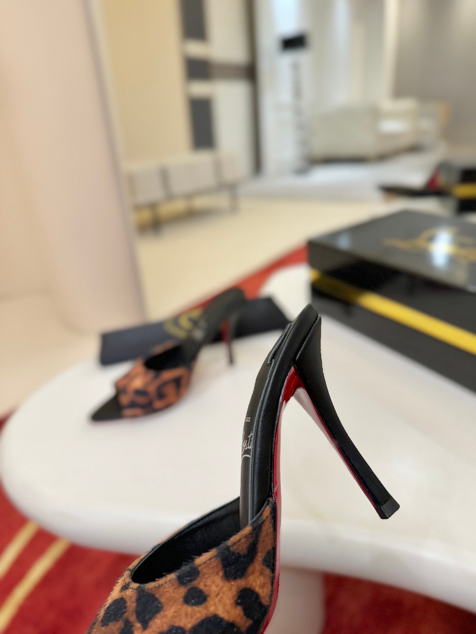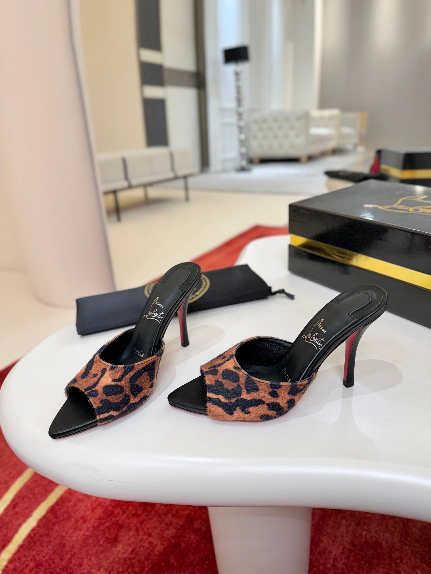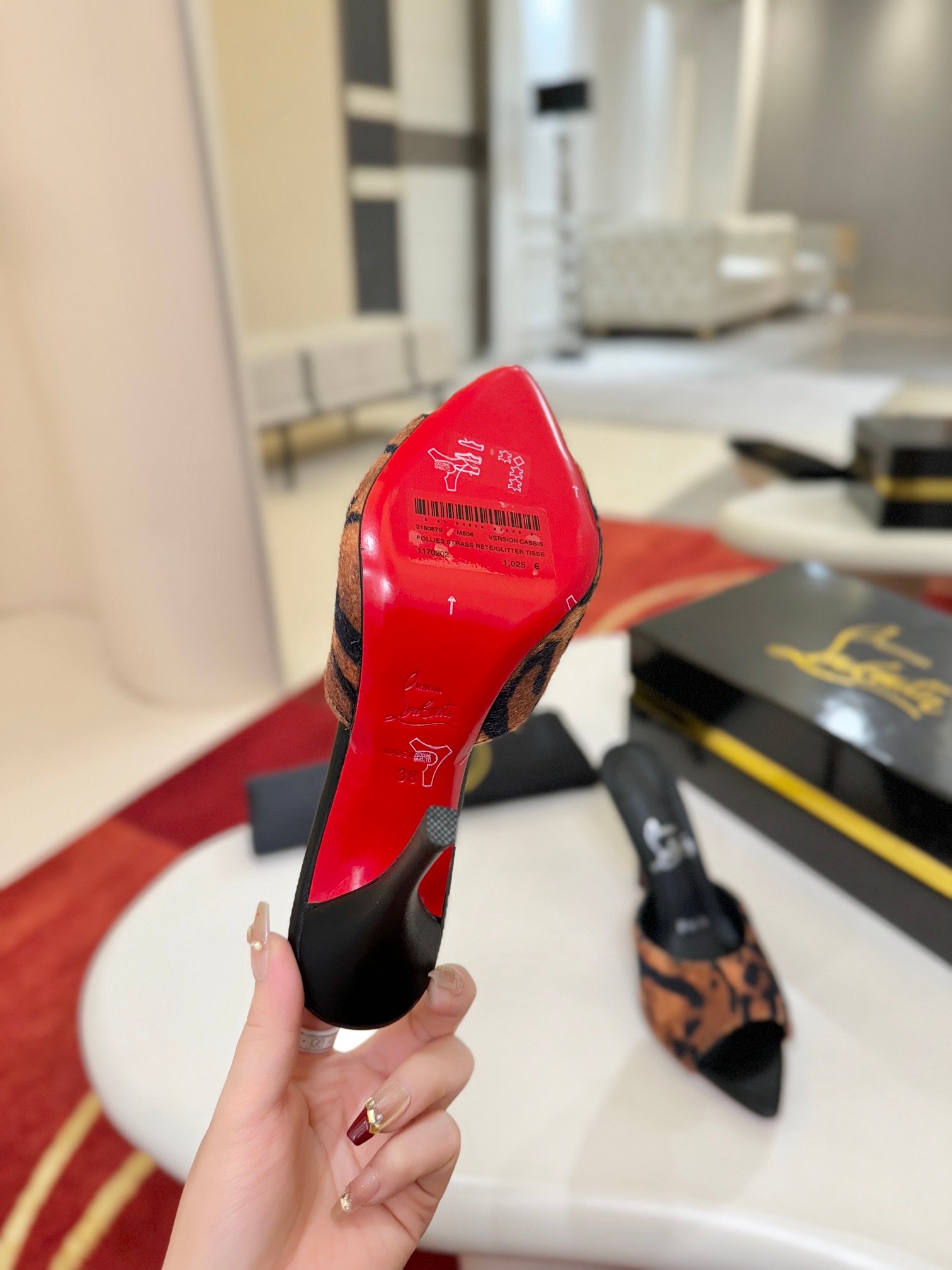 - Material: Black patent leather with peep-toe design, stiletto heel, and iconic red lacquered sole