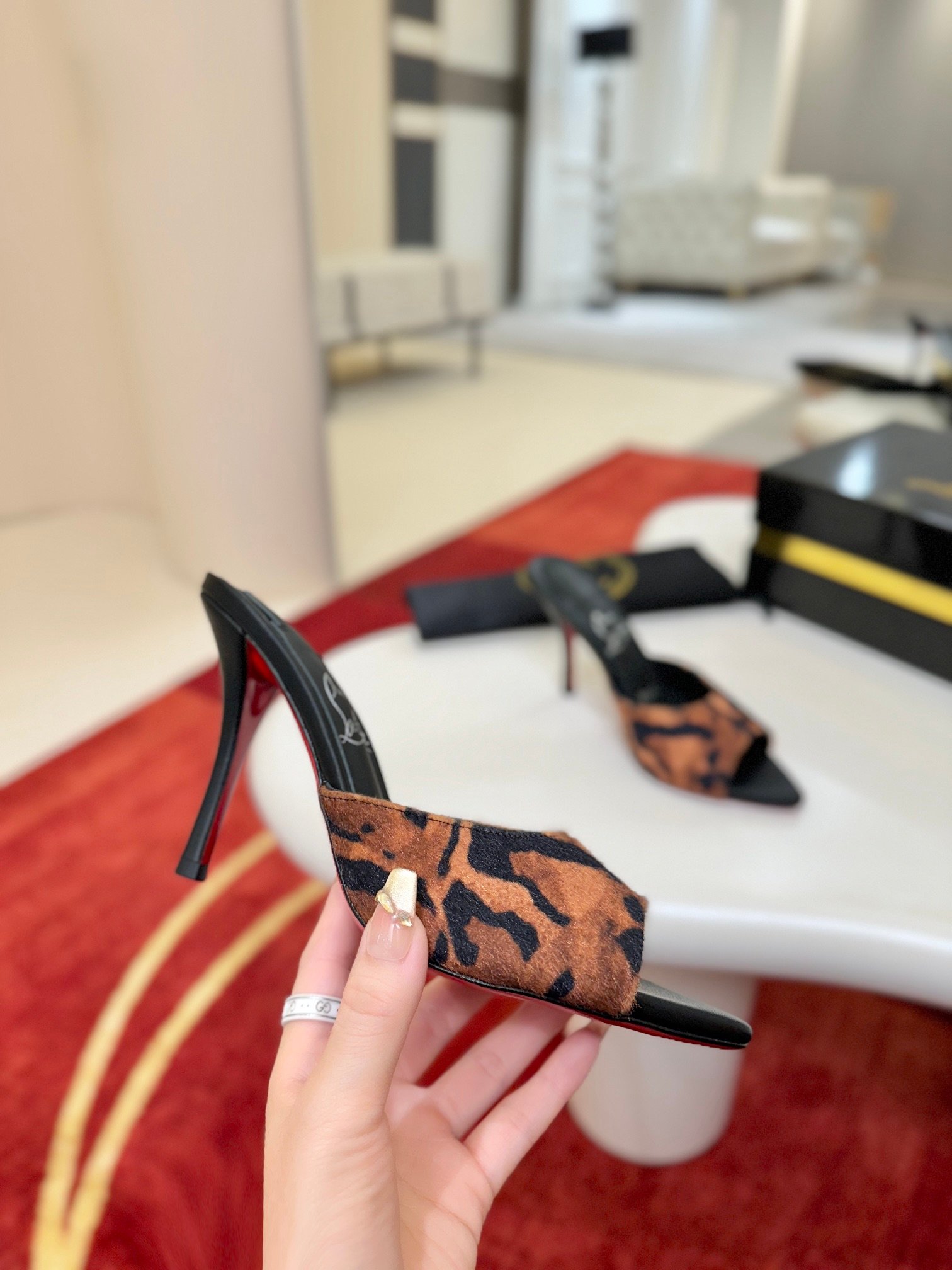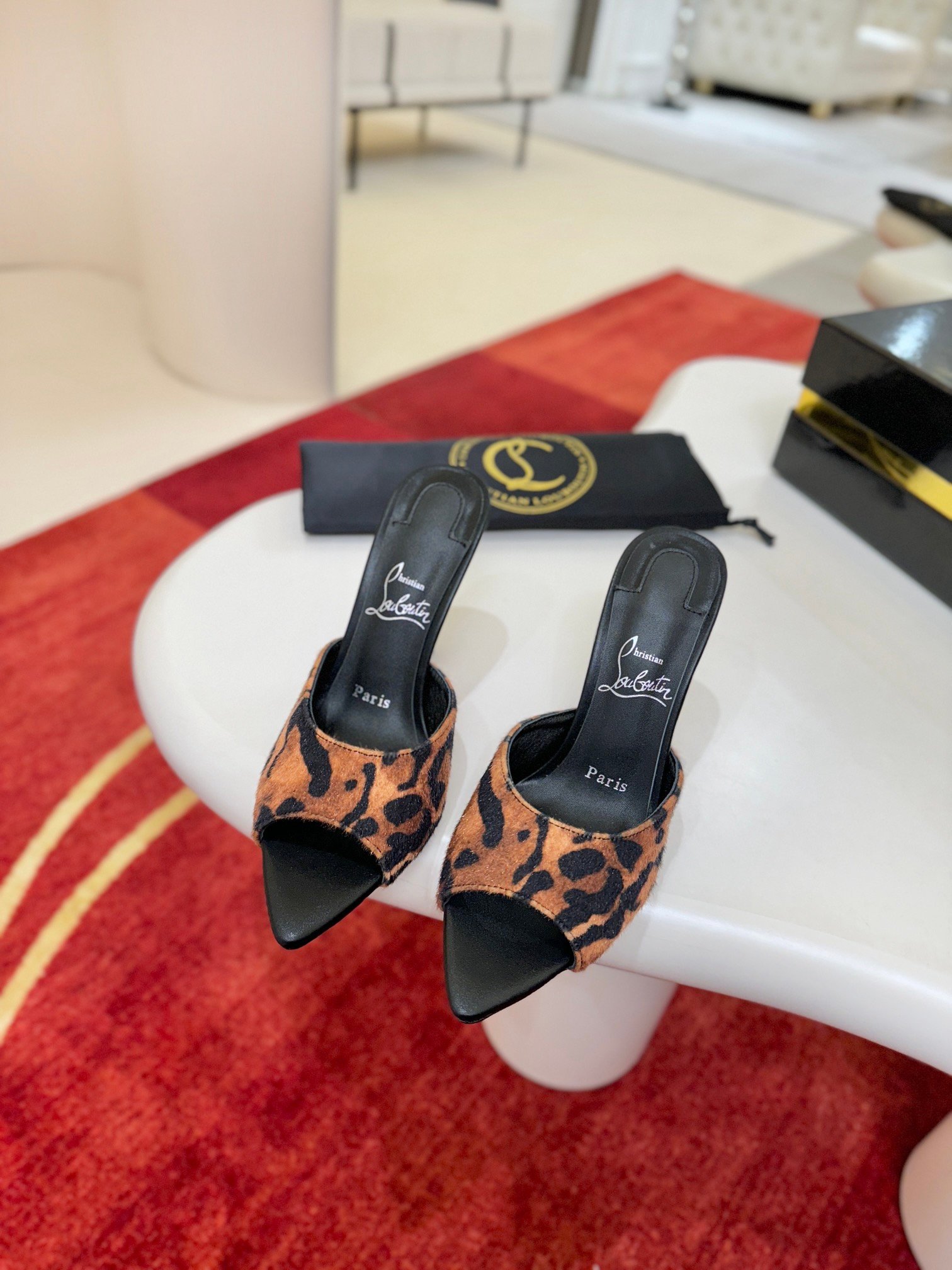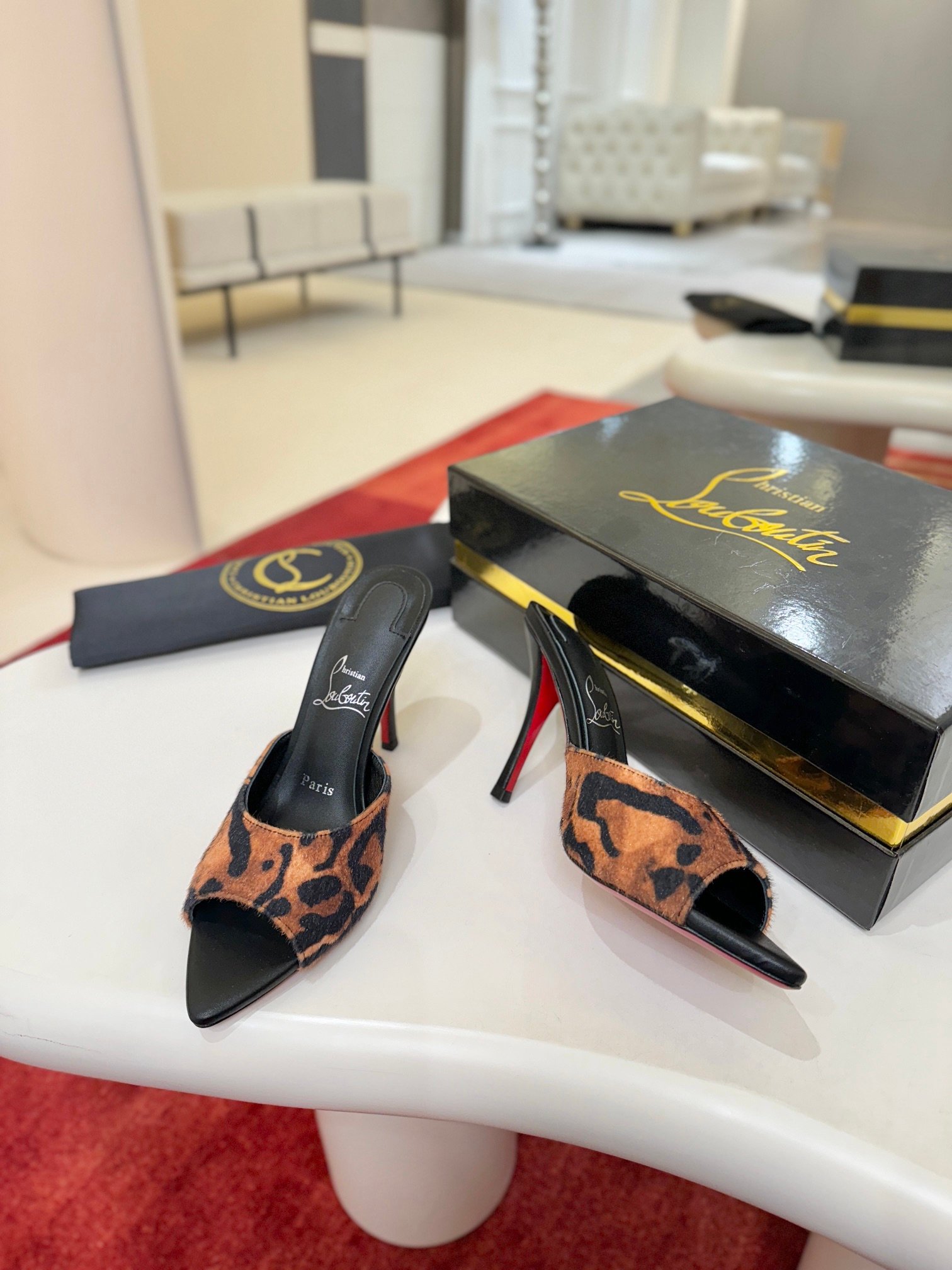 - Material: Black patent leather with peep-toe design, stiletto heel, and iconic red lacquered sole