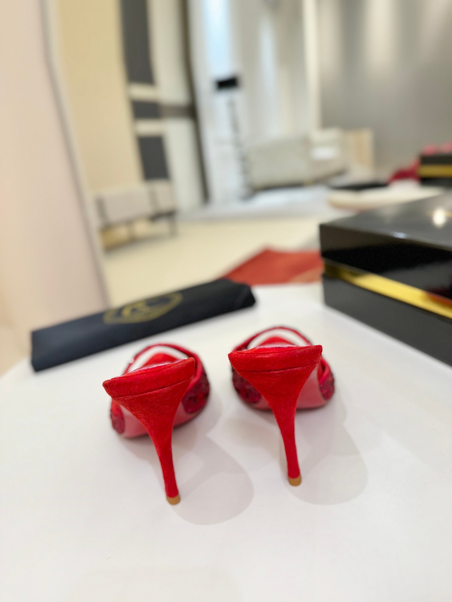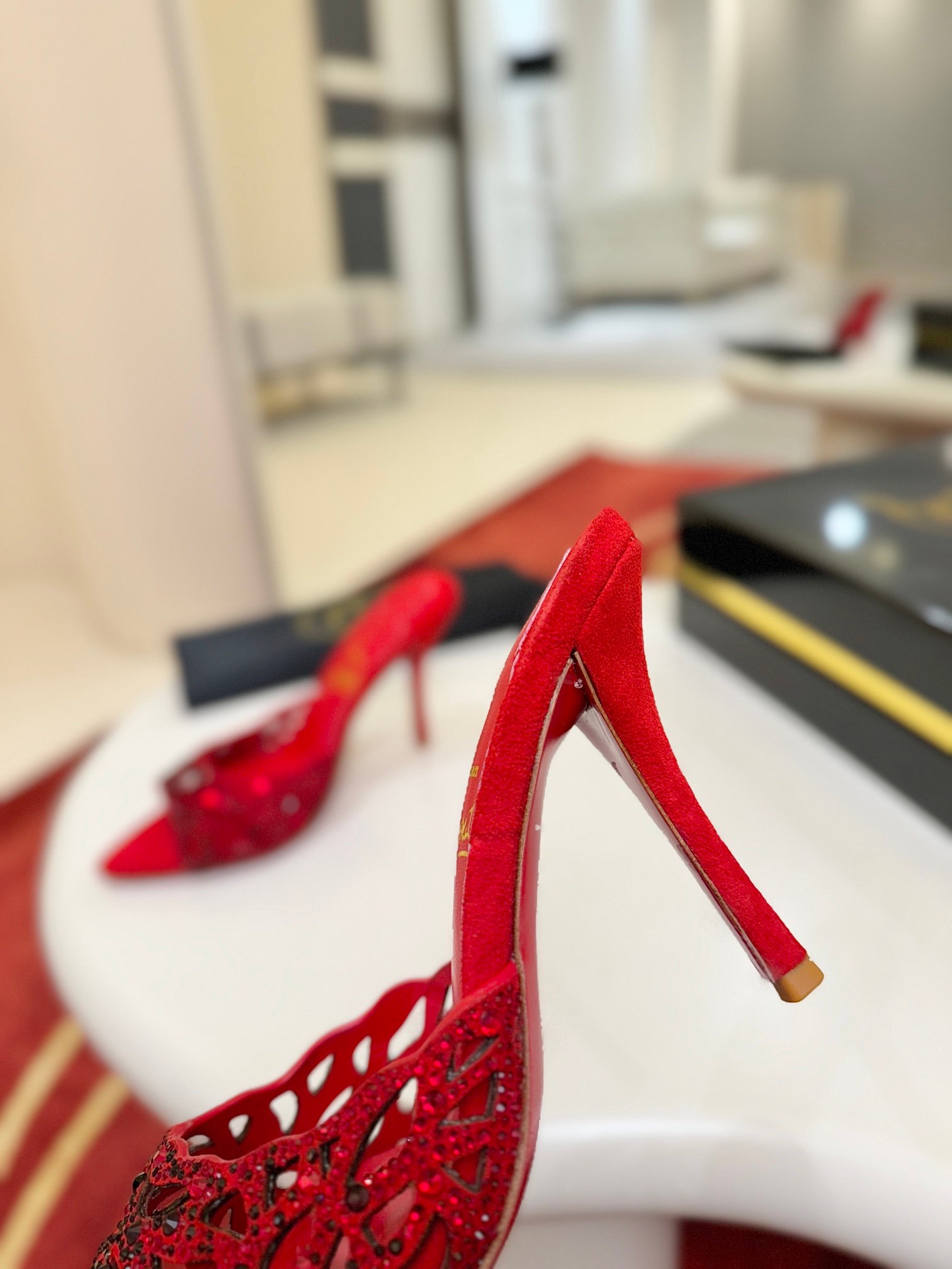- Material: Black suede with multicolored crystal embellishments, cut-out detailing, open toe, stiletto heel, and iconic red lacquered sole