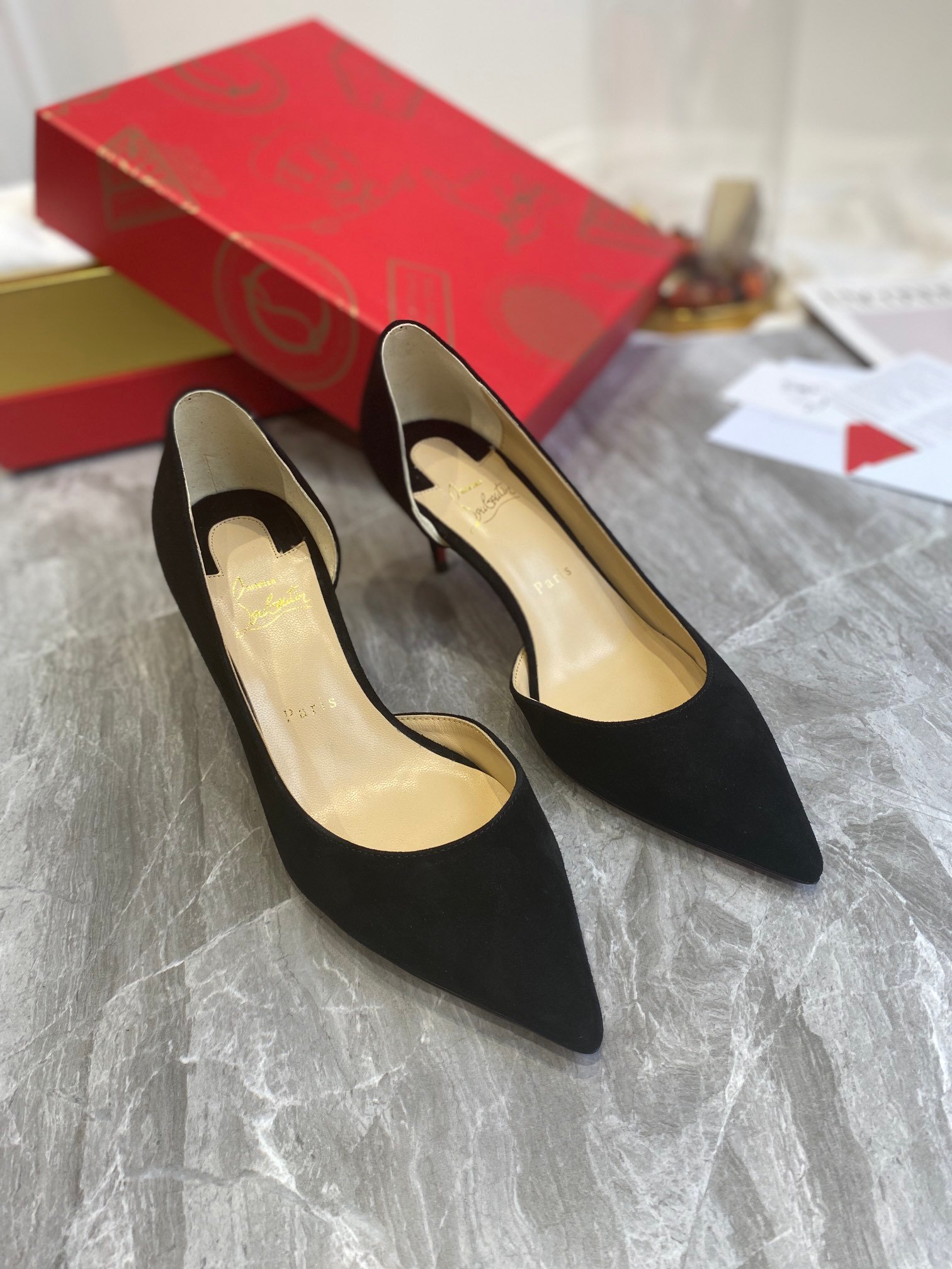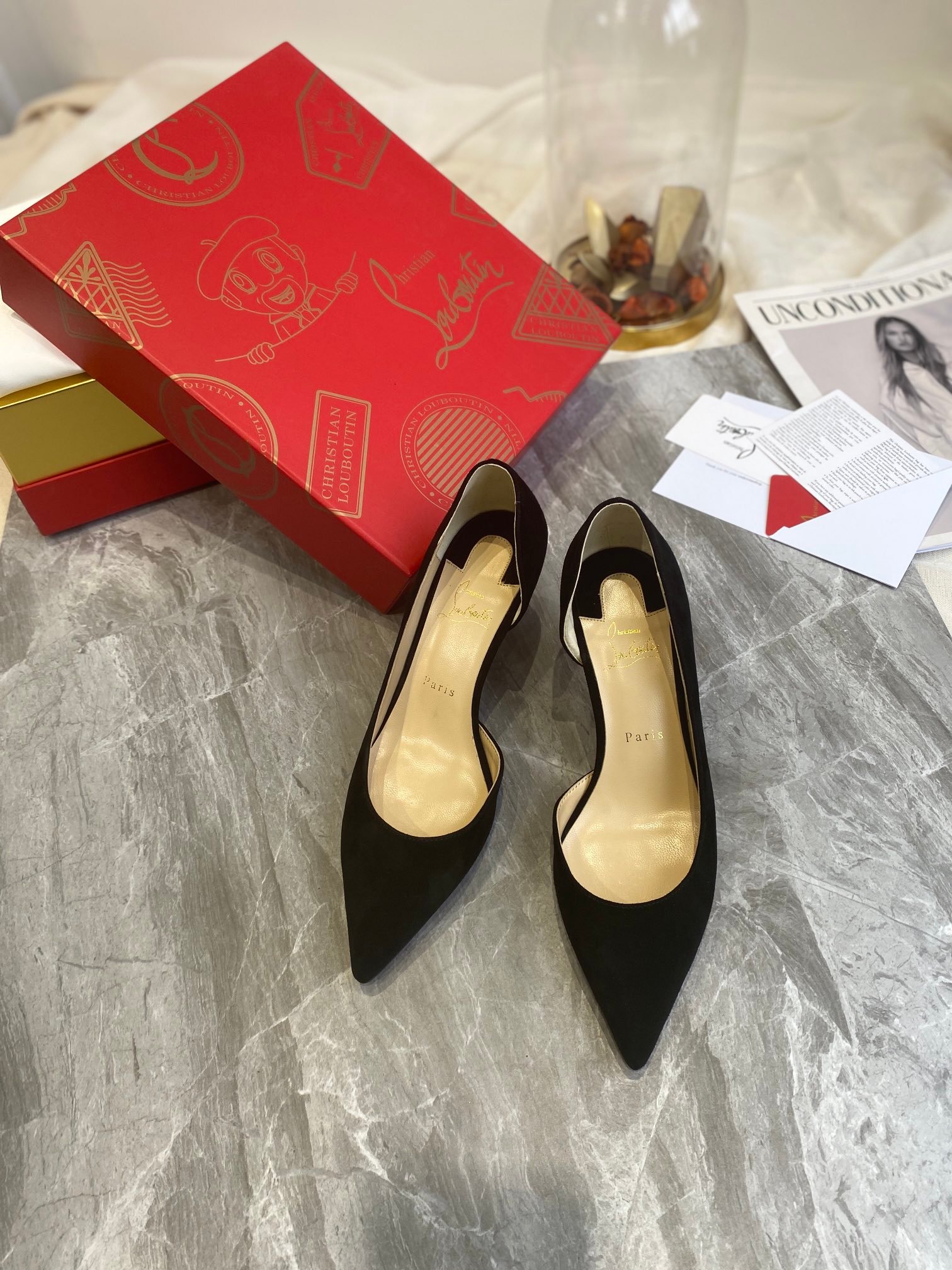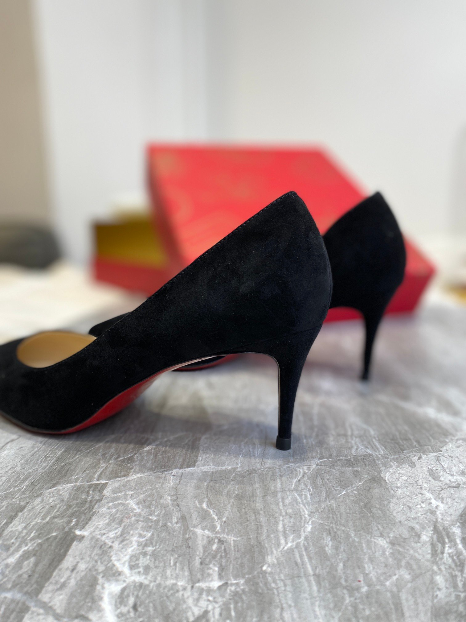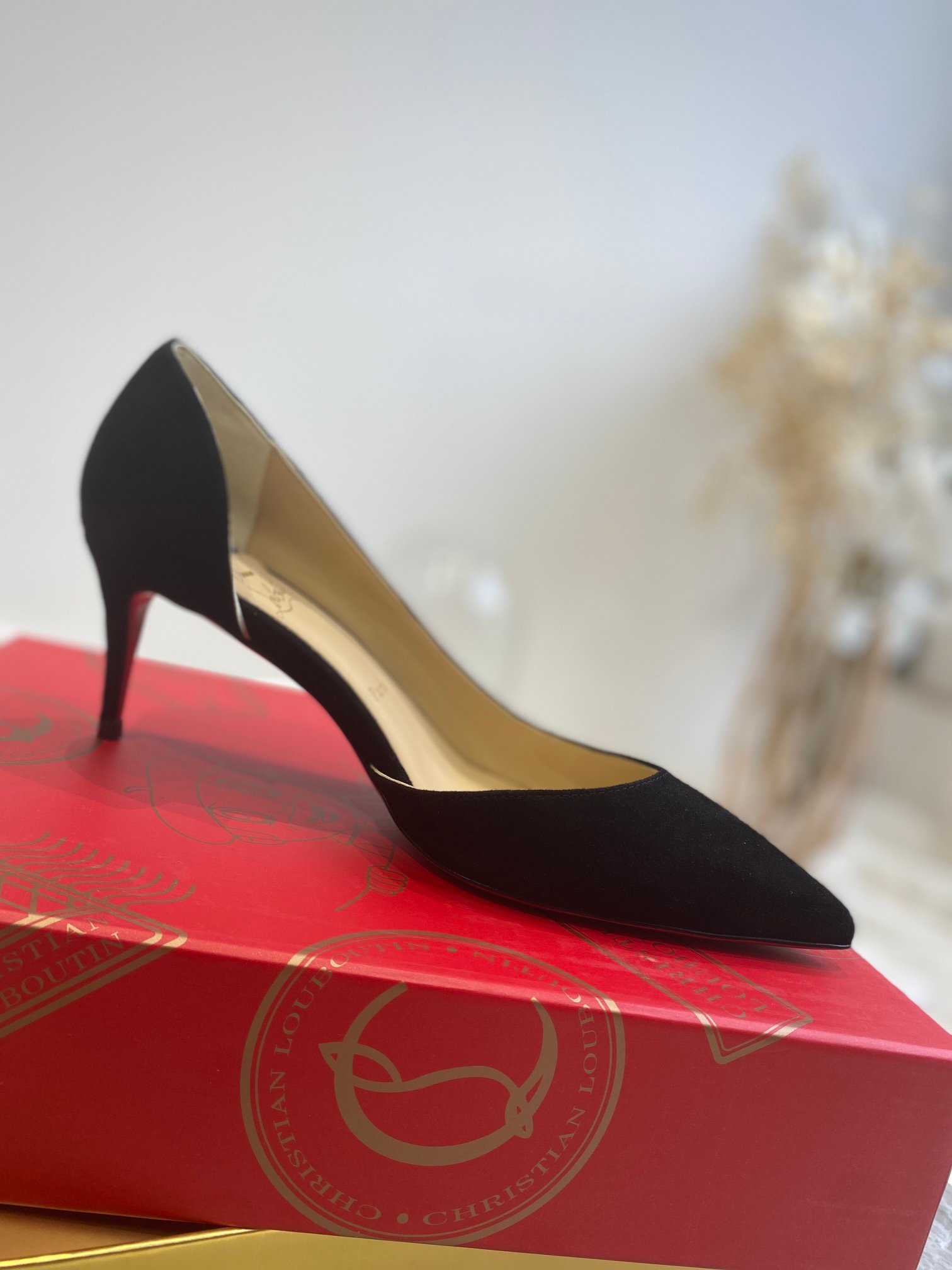 - Material: Black suede with d’Orsay cut-outs, stiletto heel, and iconic red lacquered sole