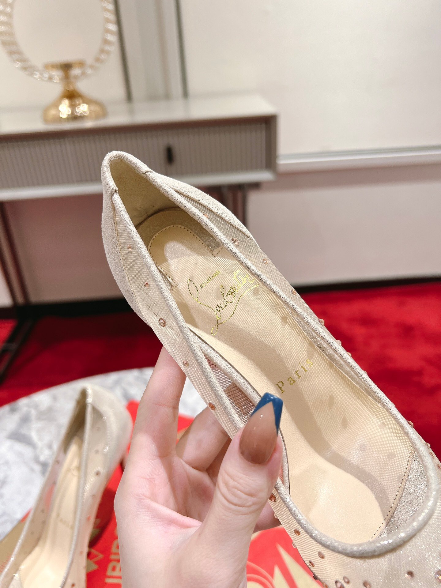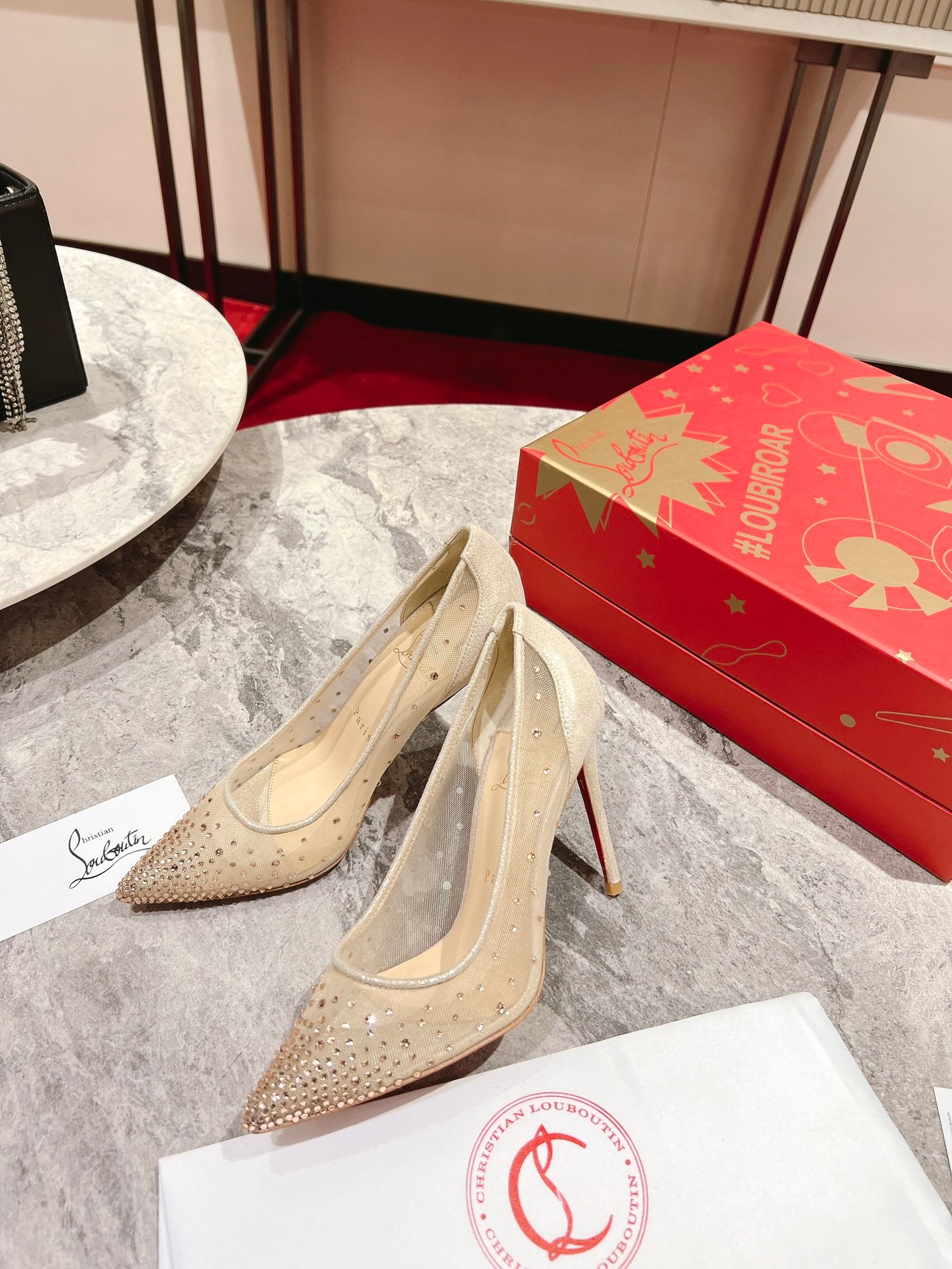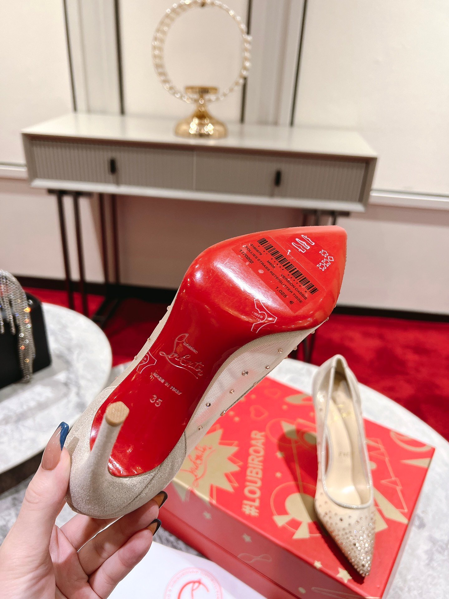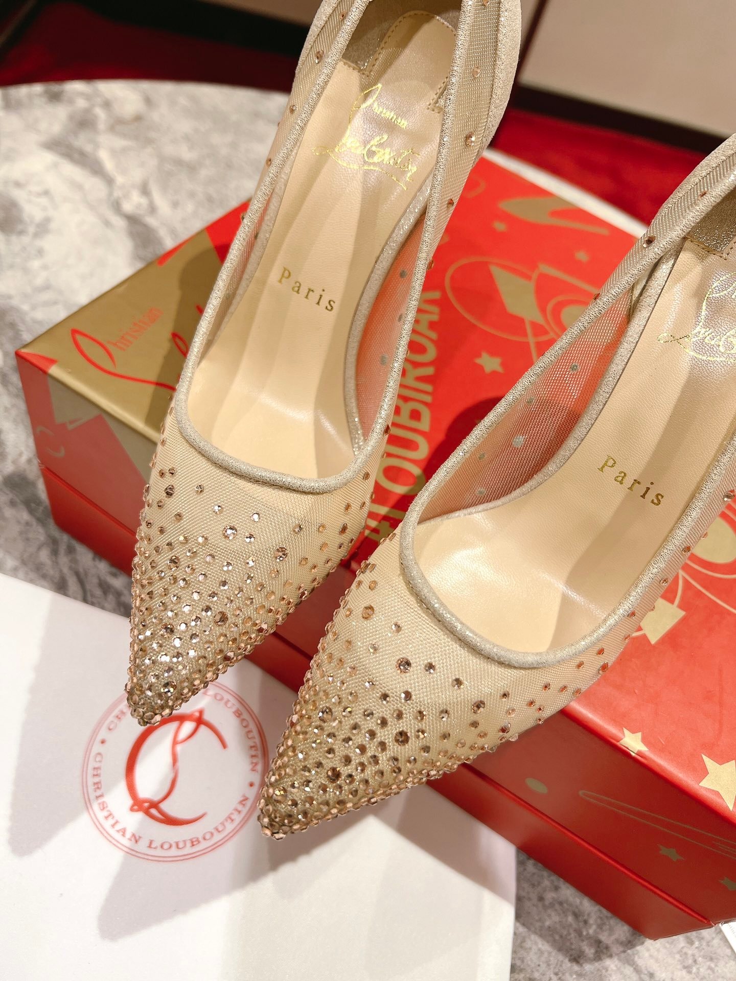 - Material: Beige mesh with gradient crystal embellishments, glitter trim, stiletto heel, and iconic red lacquered sole
