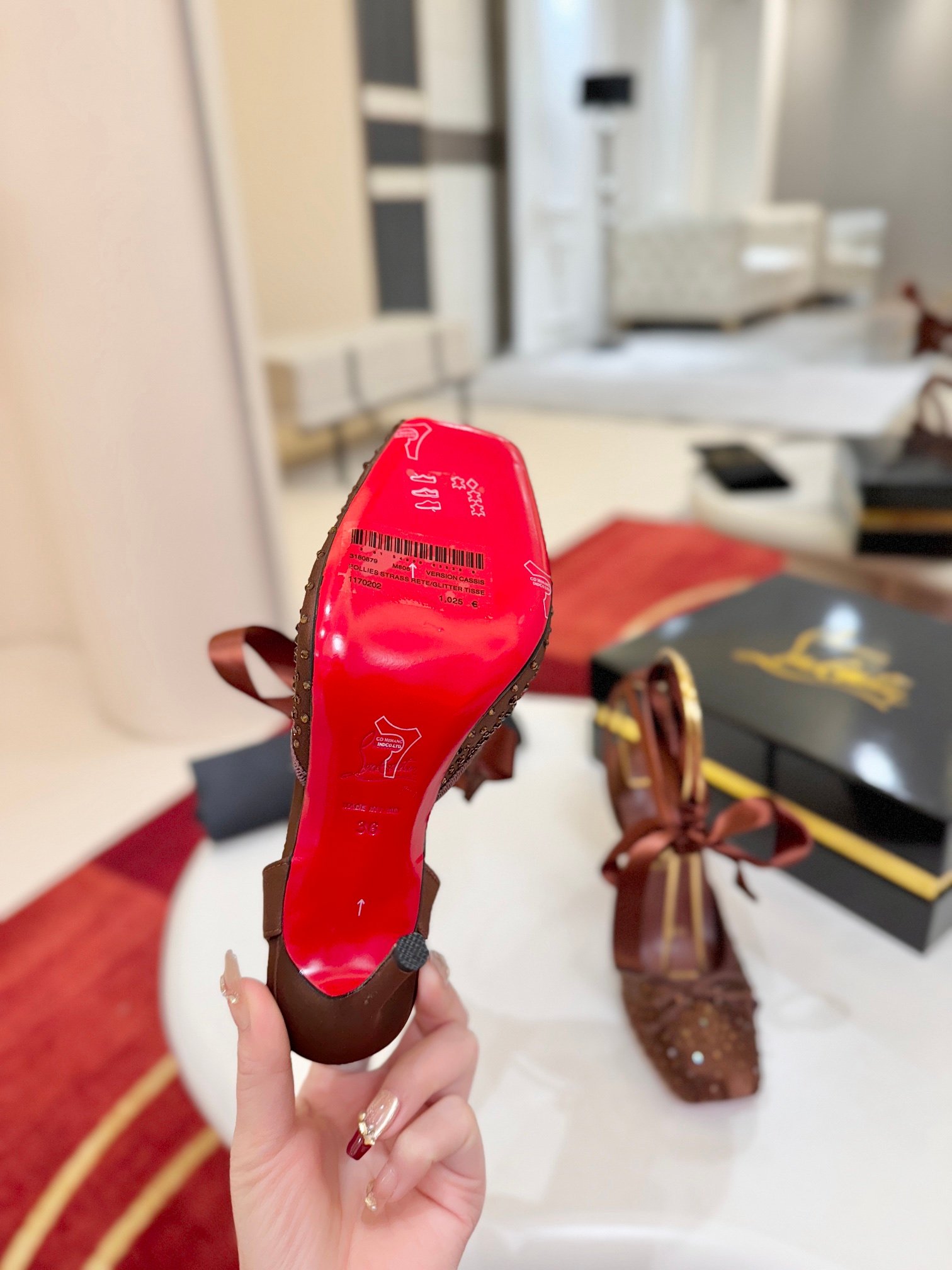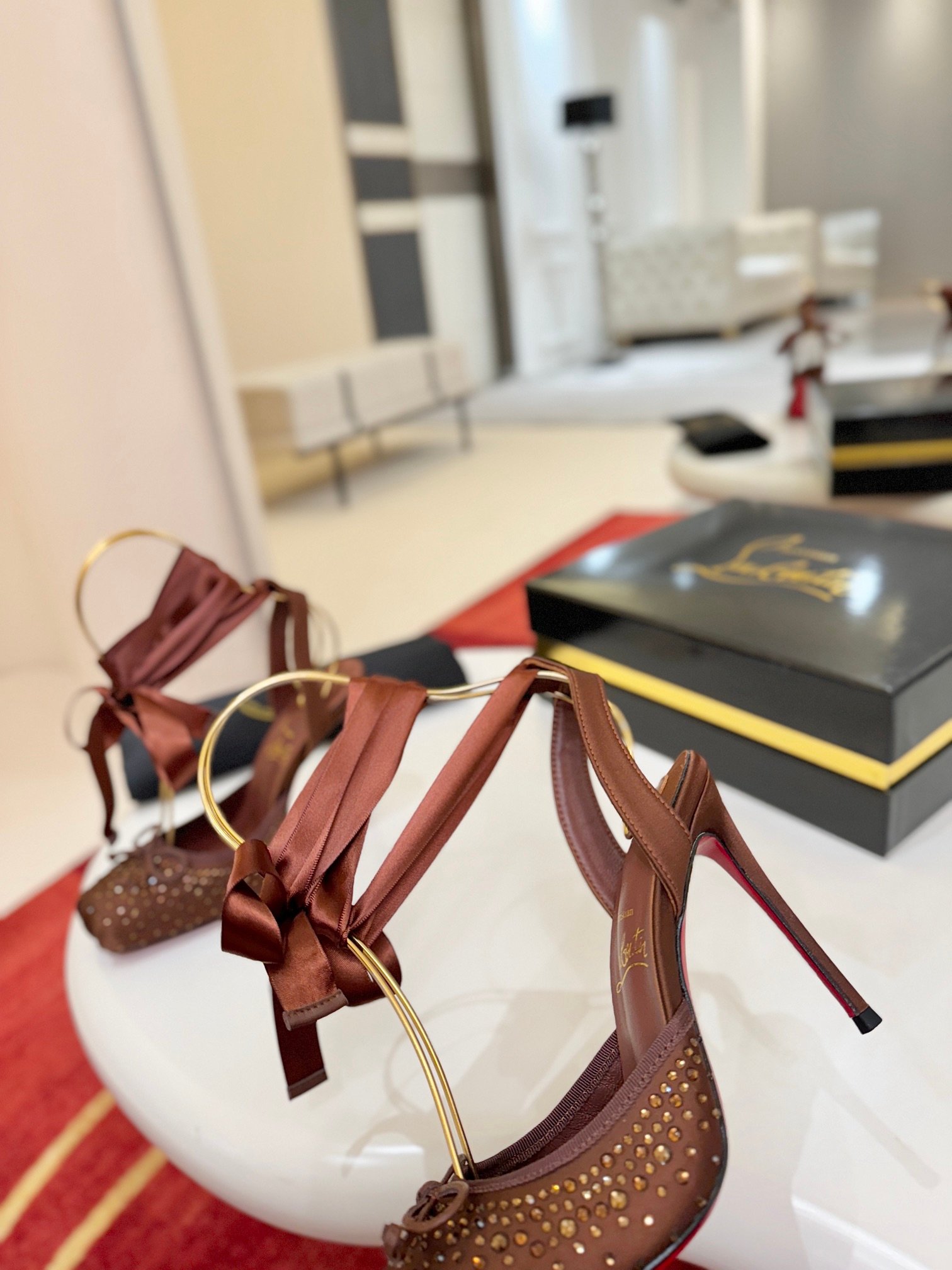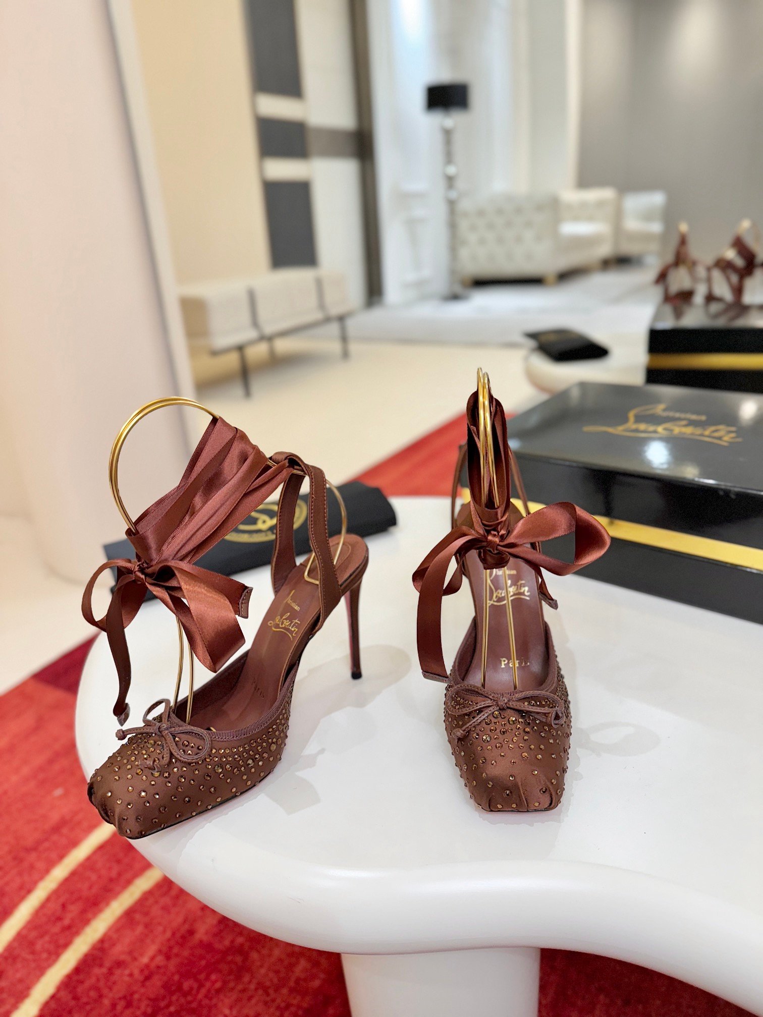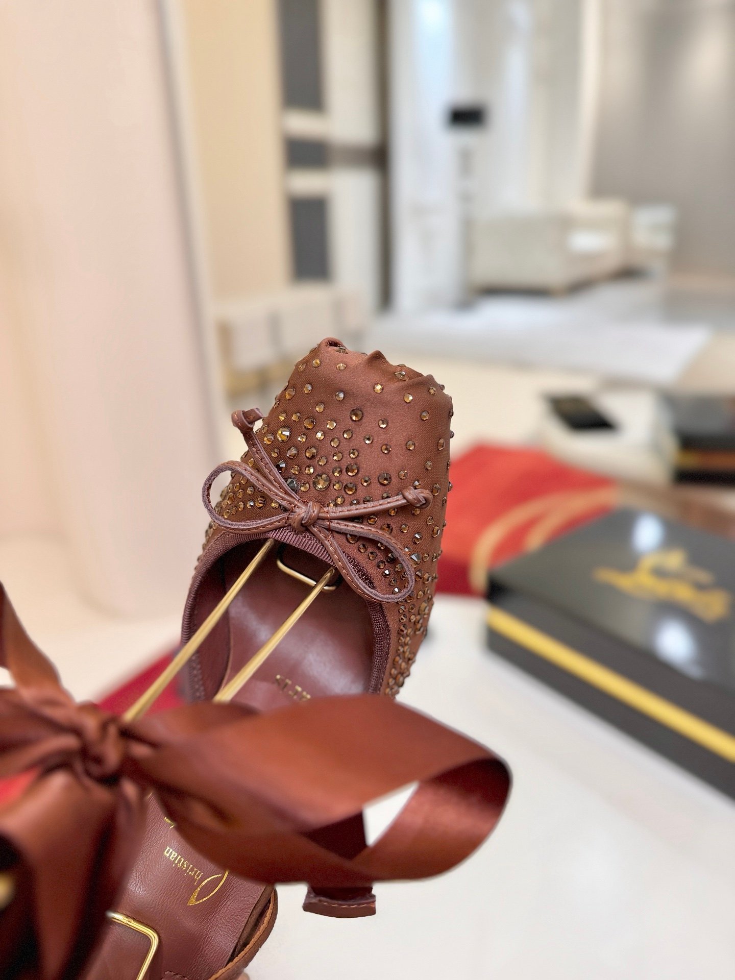 - Material: Brown satin with crystal embellishments, satin lace-up straps, and iconic red lacquered sole