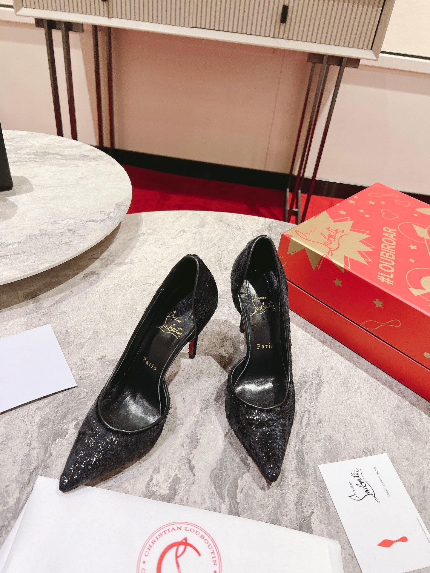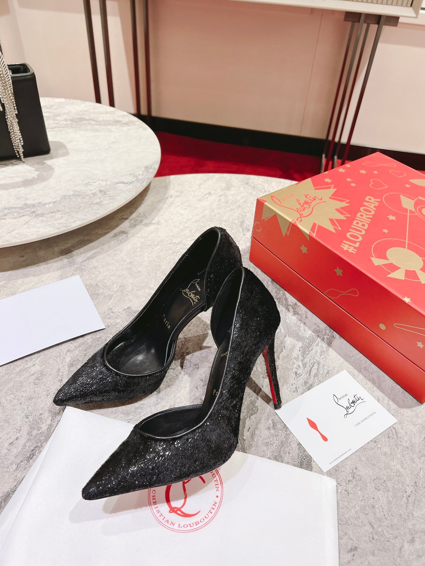 - Material: Black glittered fabric with d’Orsay cut-outs, leather trim, stiletto heel, and iconic red lacquered sole