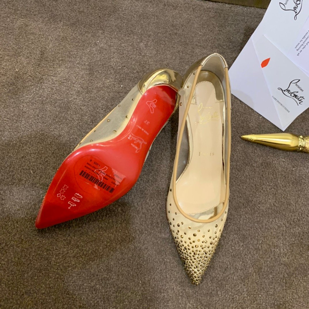 • Material: Beige mesh with gradient crystal embellishments, glitter trim, stiletto heel, and iconic red lacquered sole