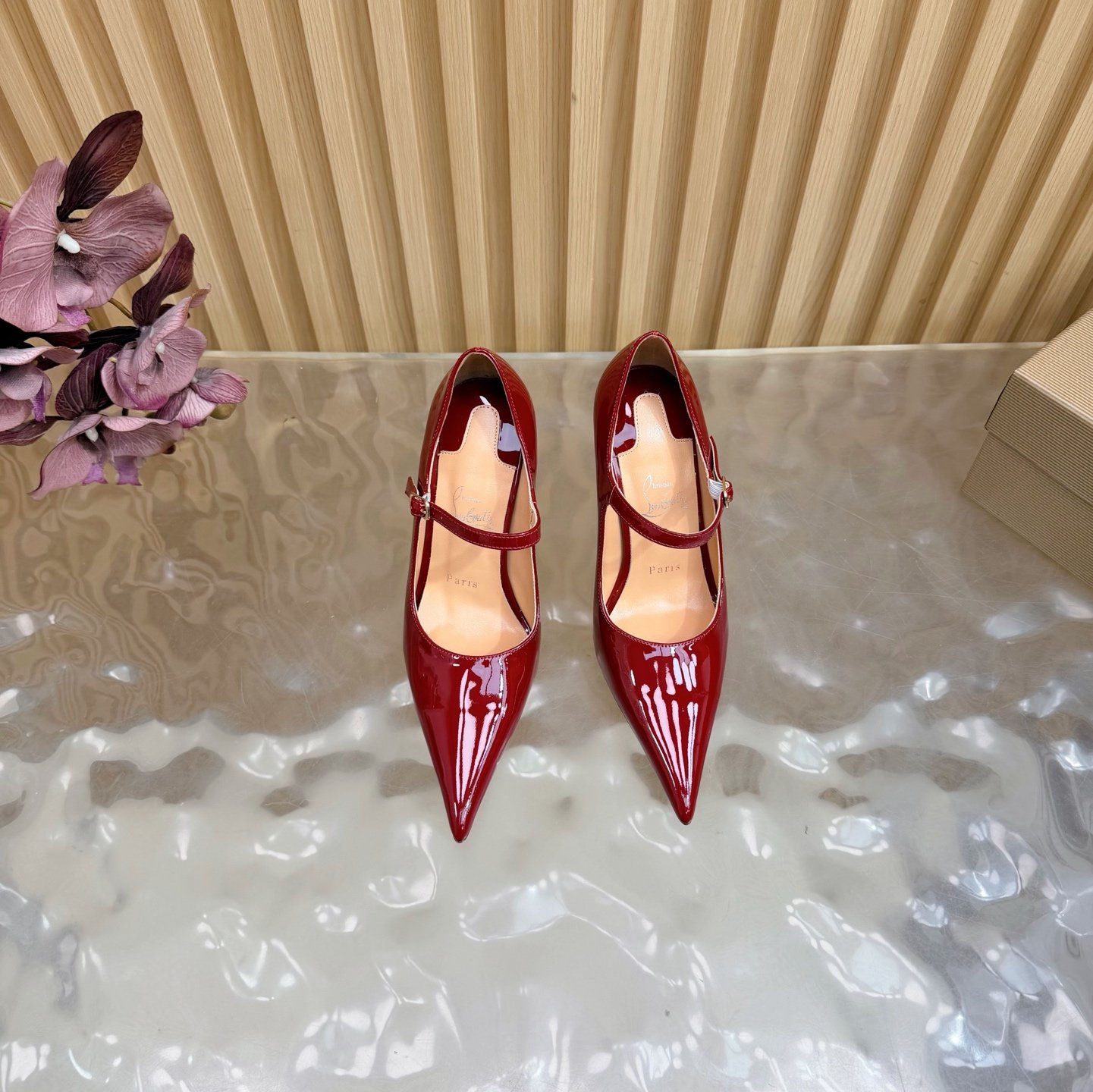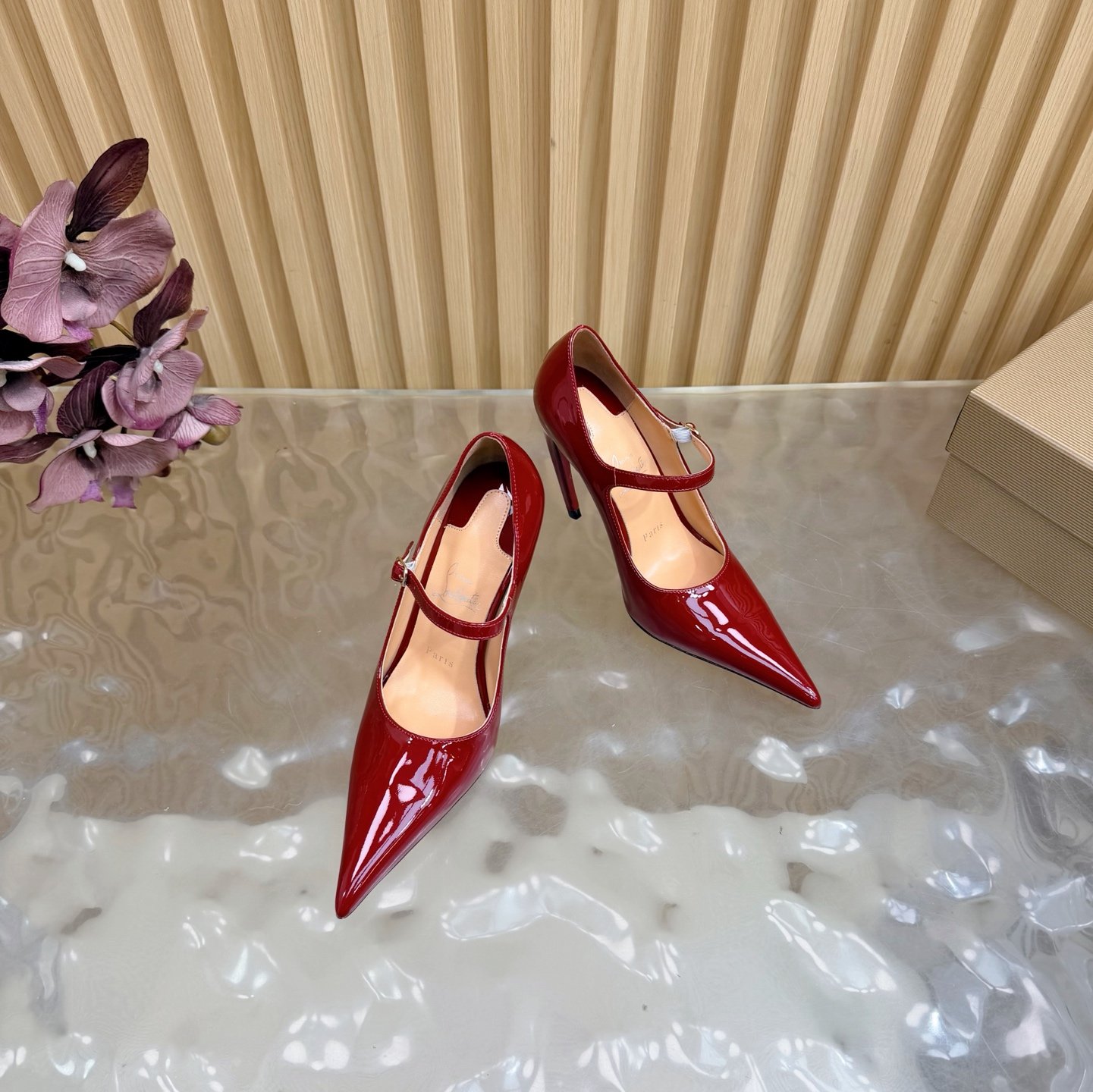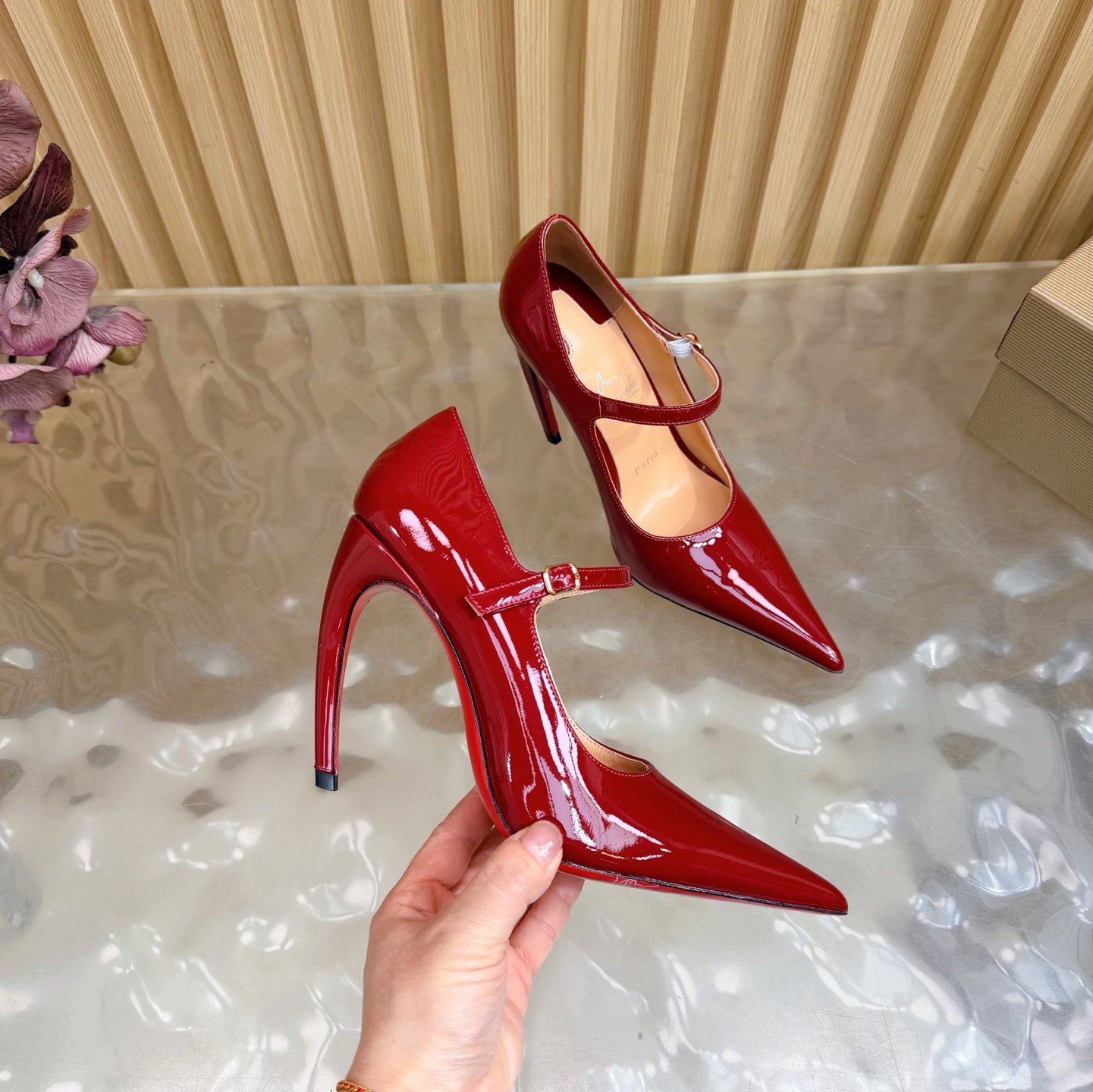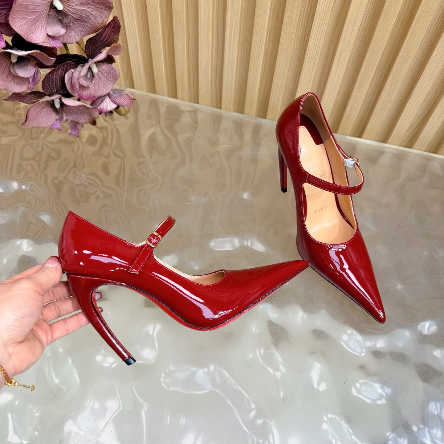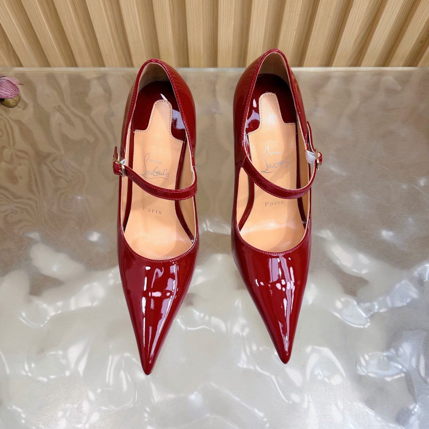 - Material: Red patent leather with adjustable Mary Jane strap, stiletto heel, and iconic red lacquered sole