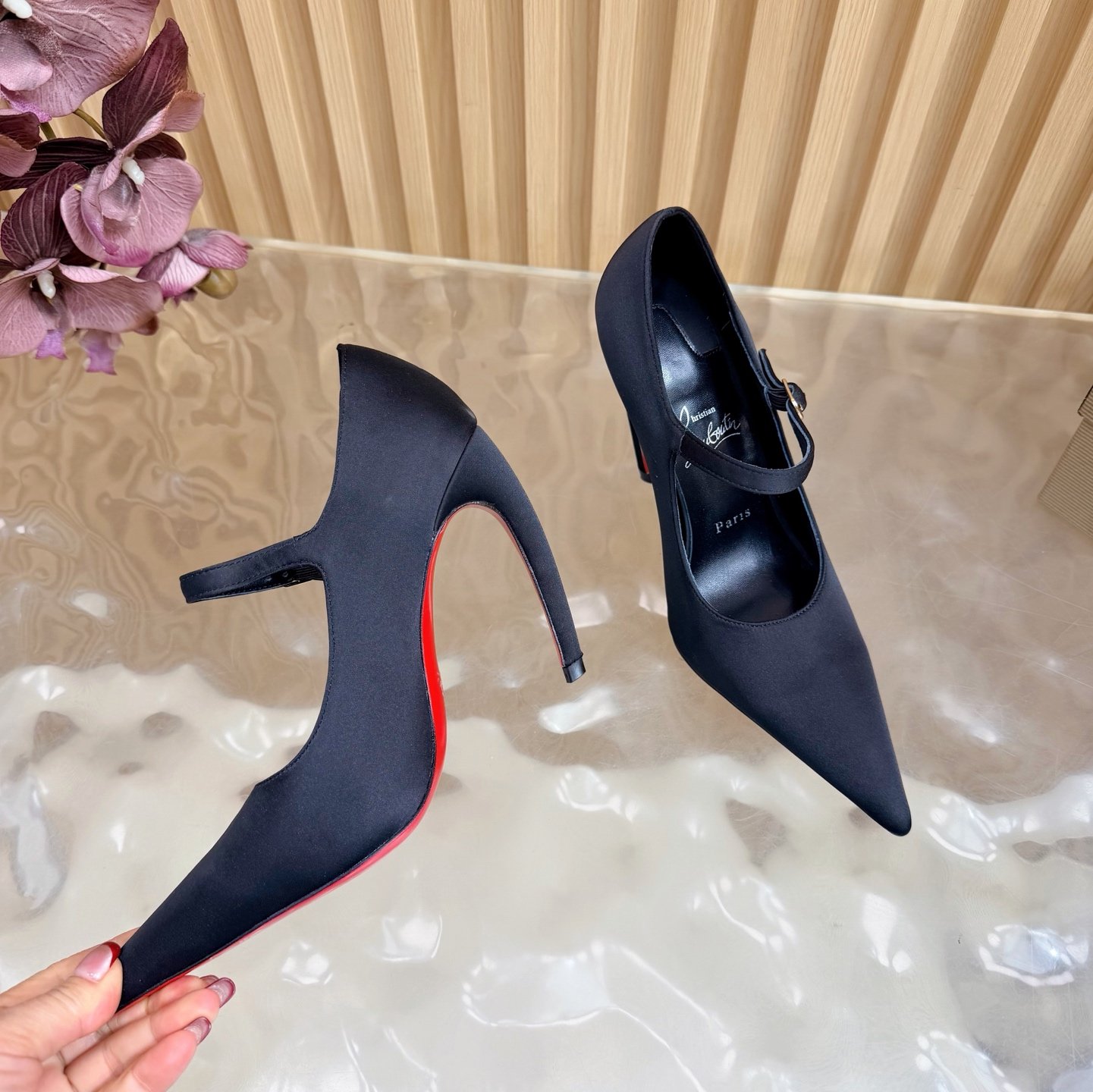 - Material: Red patent leather with adjustable Mary Jane strap, stiletto heel, and iconic red lacquered sole
