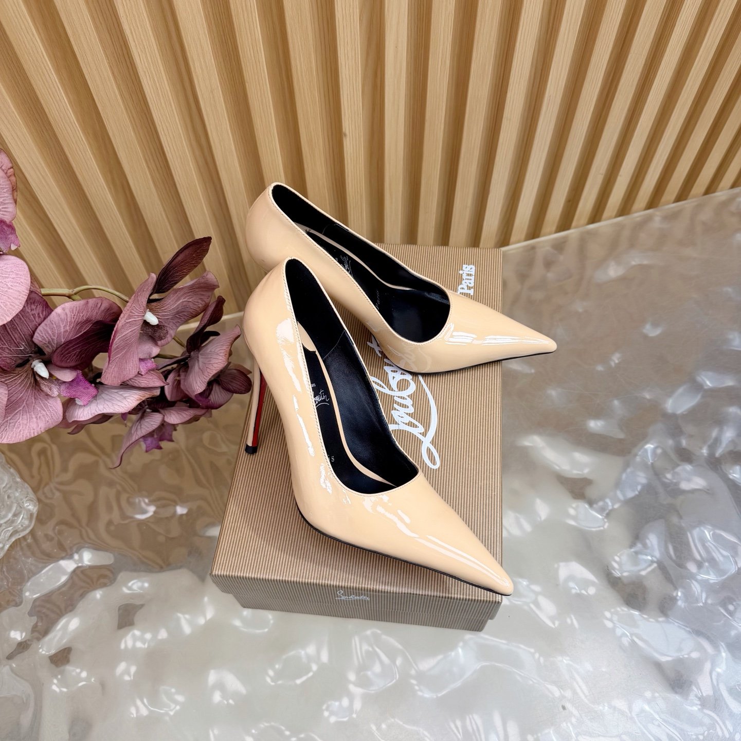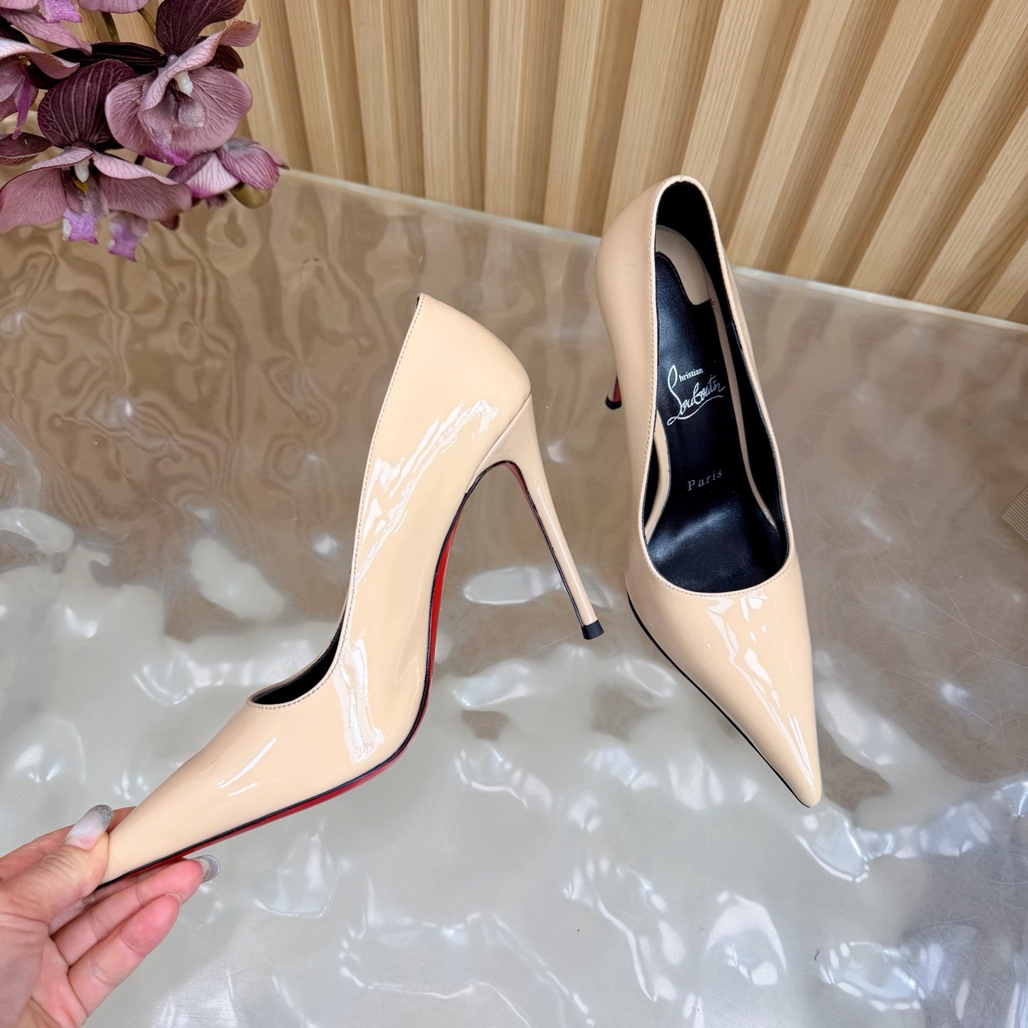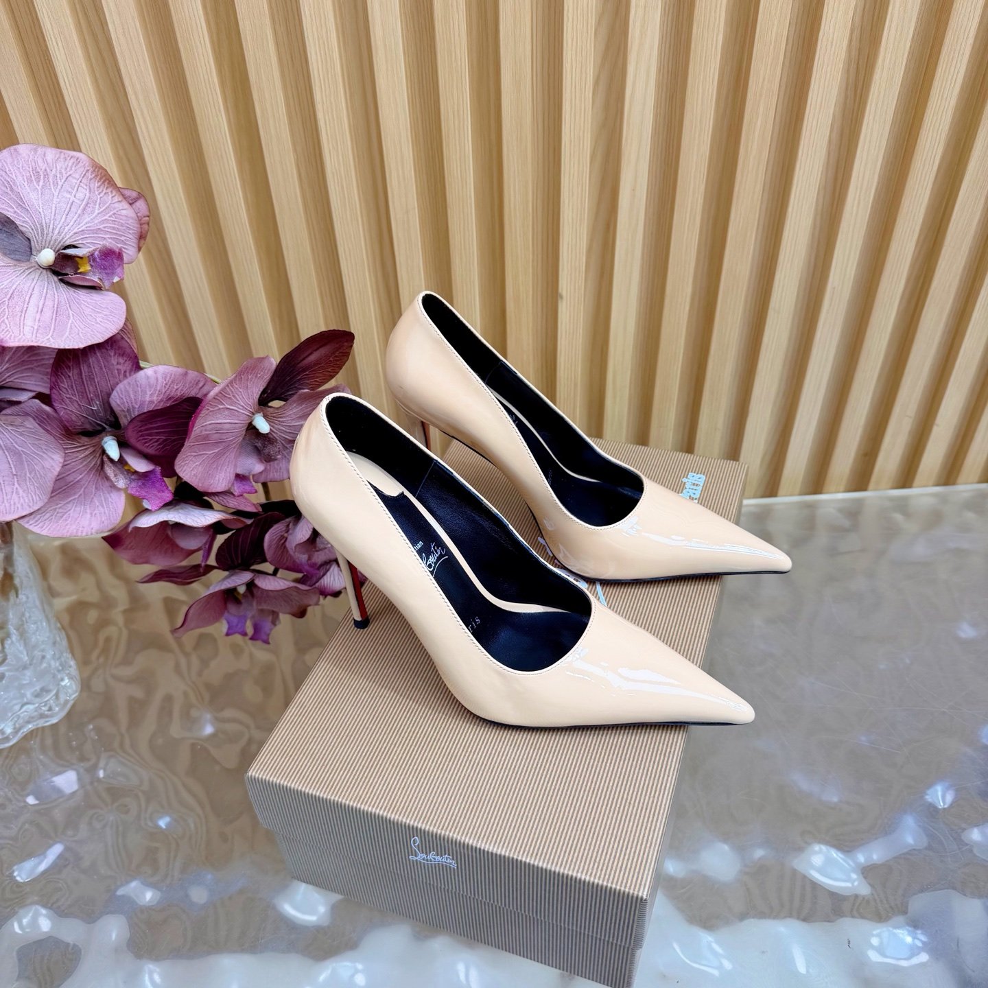 - Material: Black patent leather with stiletto heel and iconic red lacquered sole