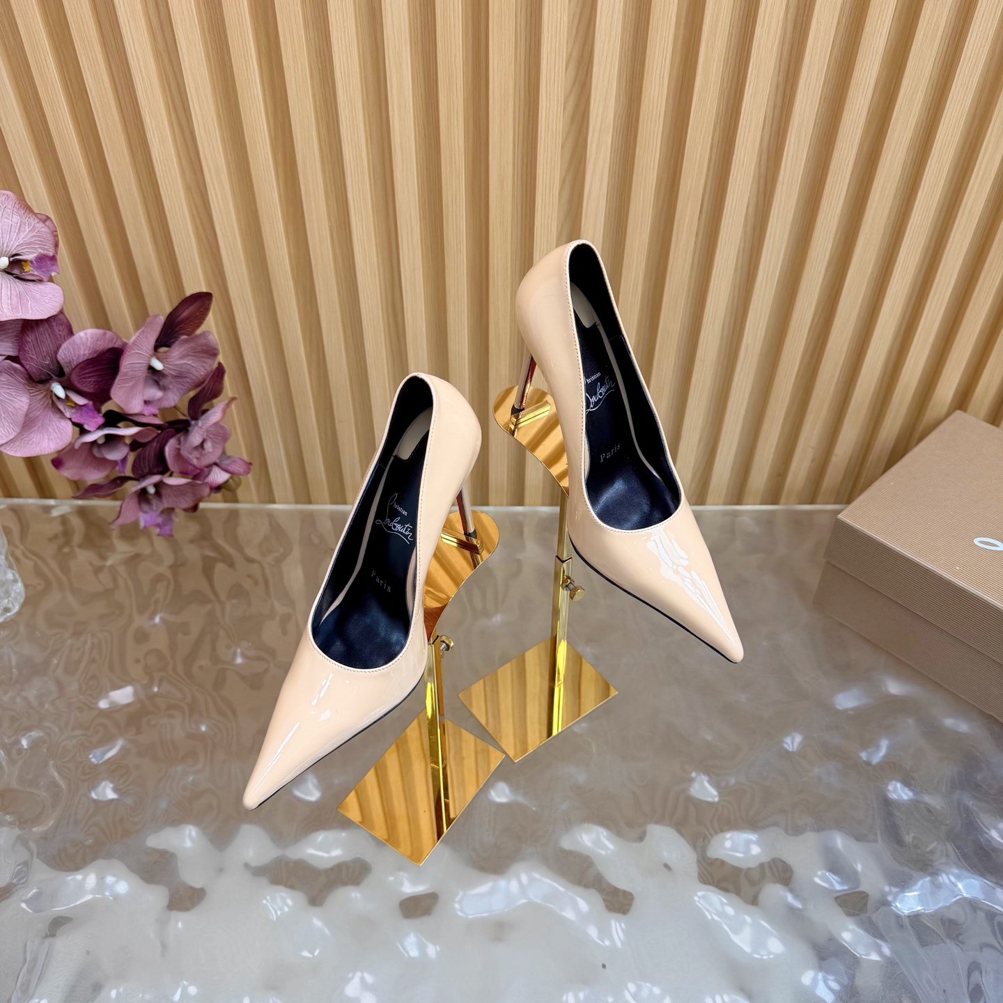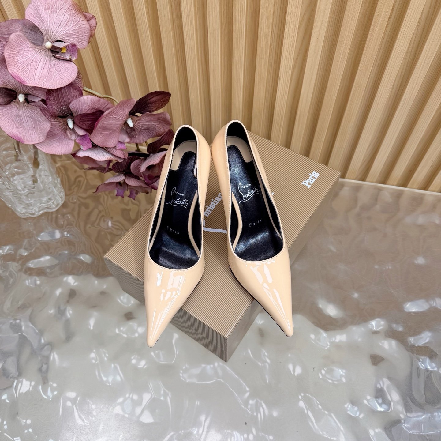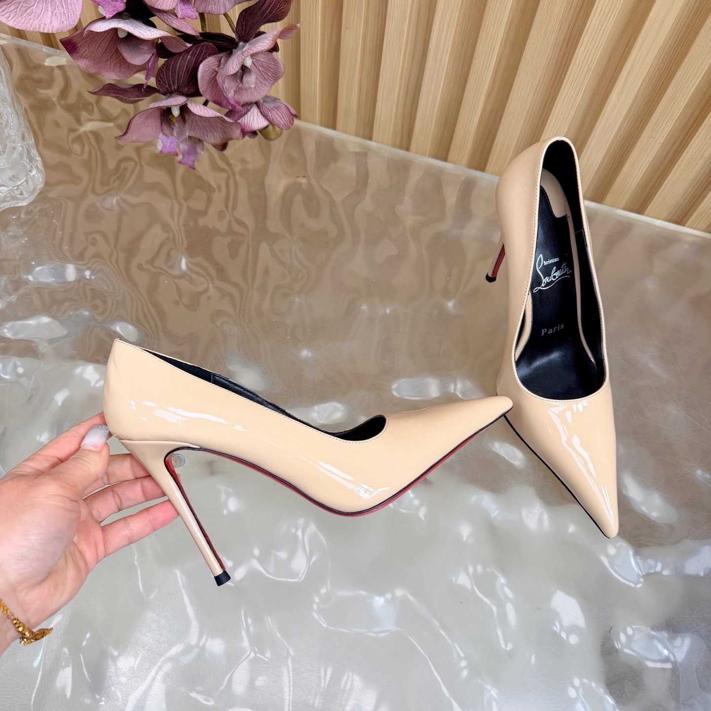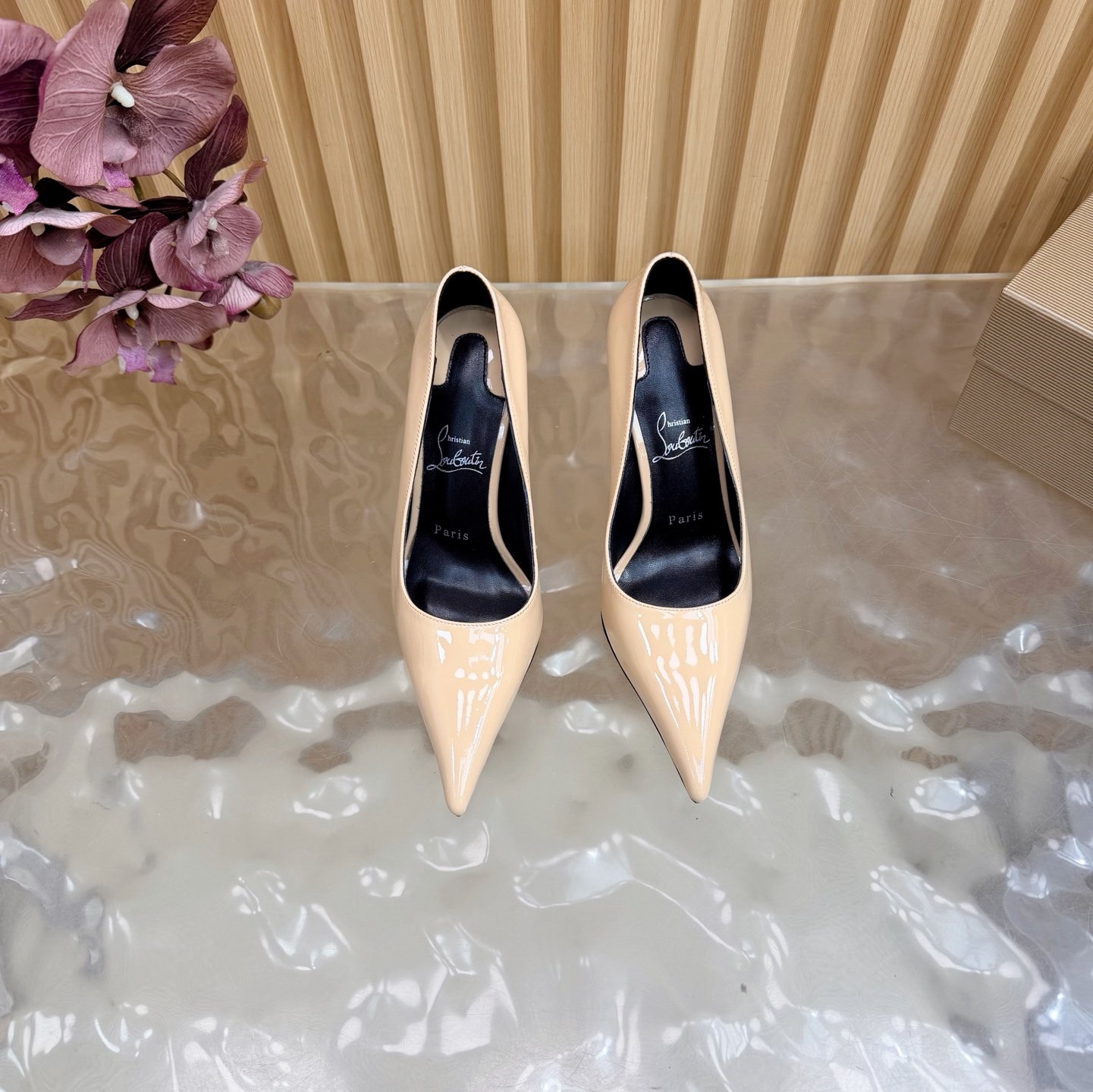 - Material: Black patent leather with stiletto heel and iconic red lacquered sole