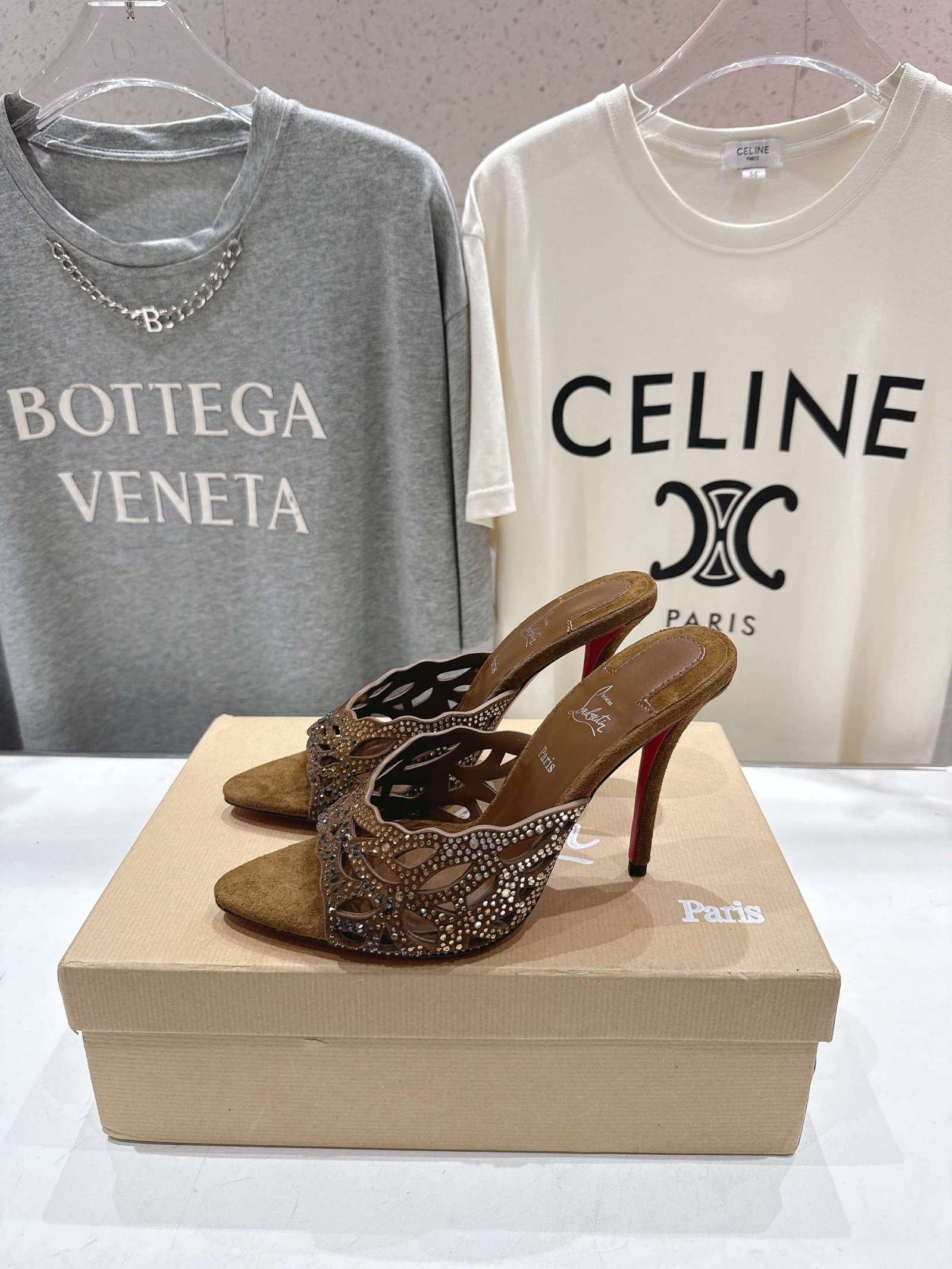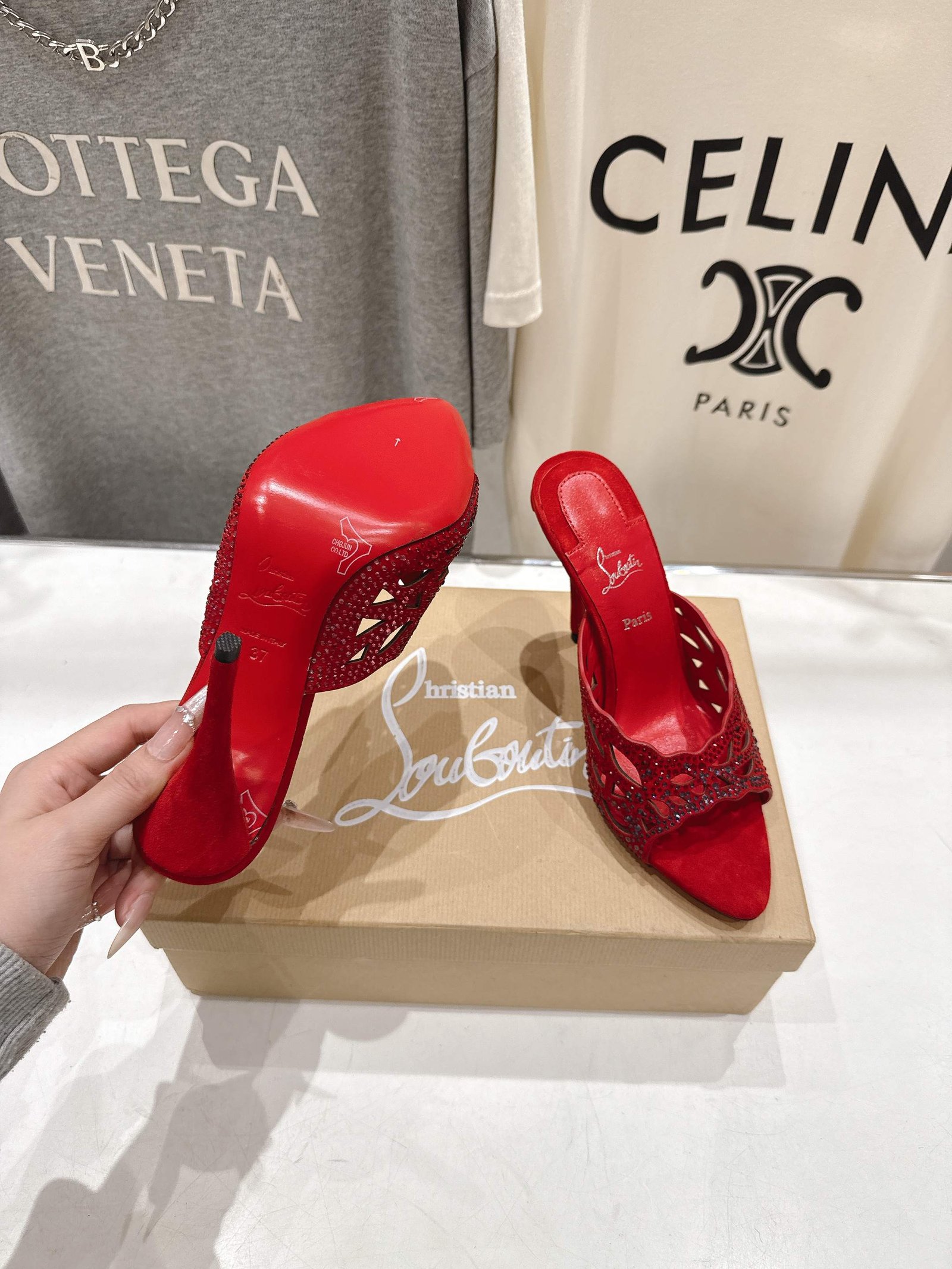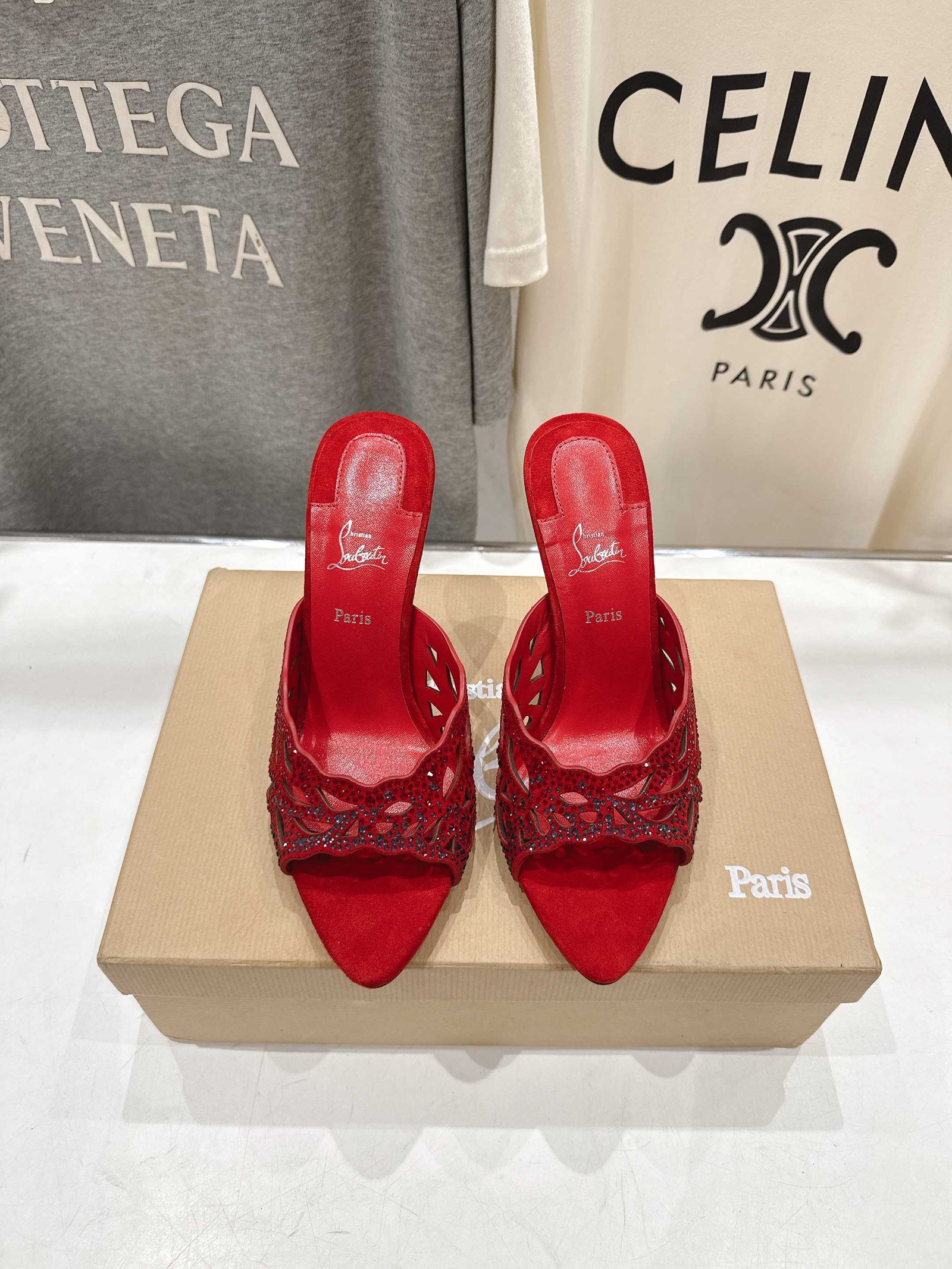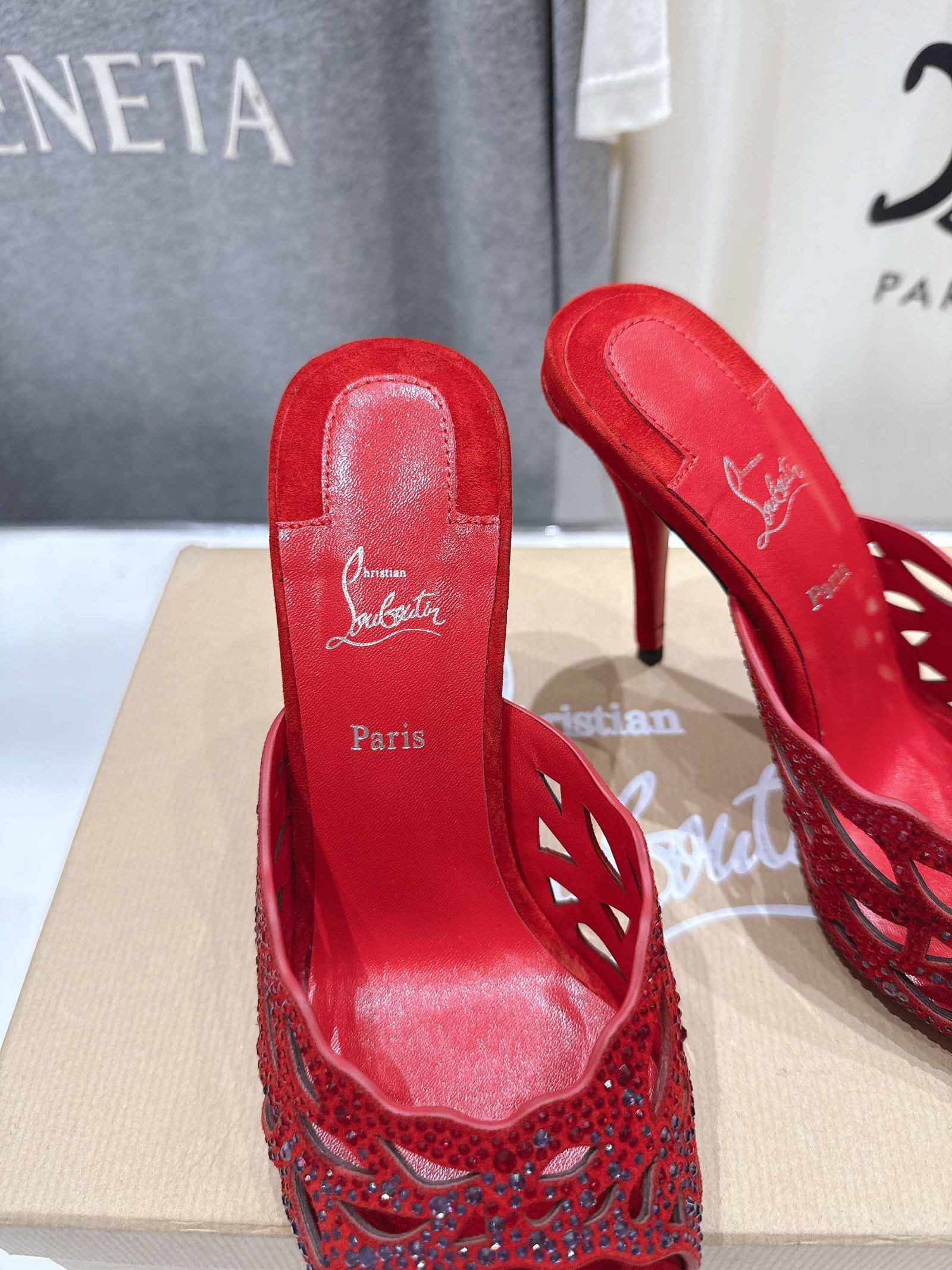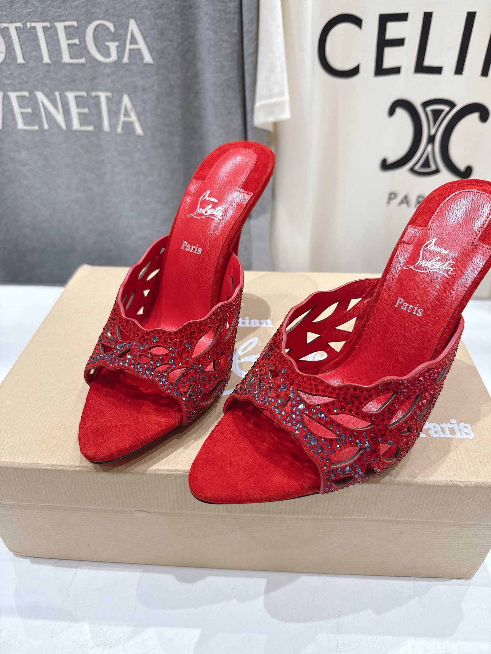 - Material: Red suede with crystal embellishments, cut-out detailing, open toe, block heel, and iconic red lacquered sole