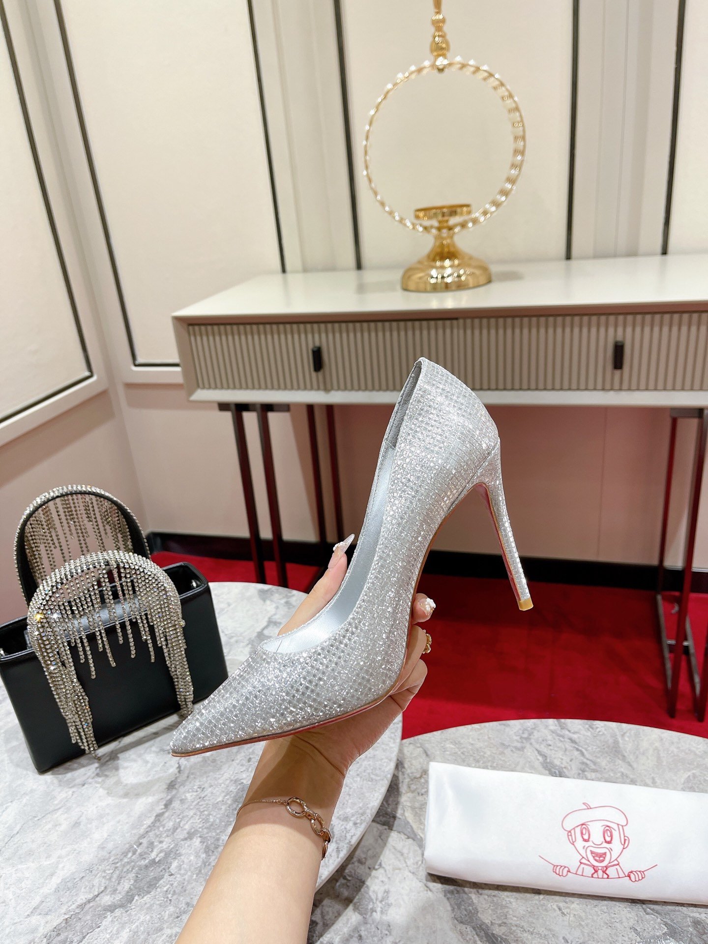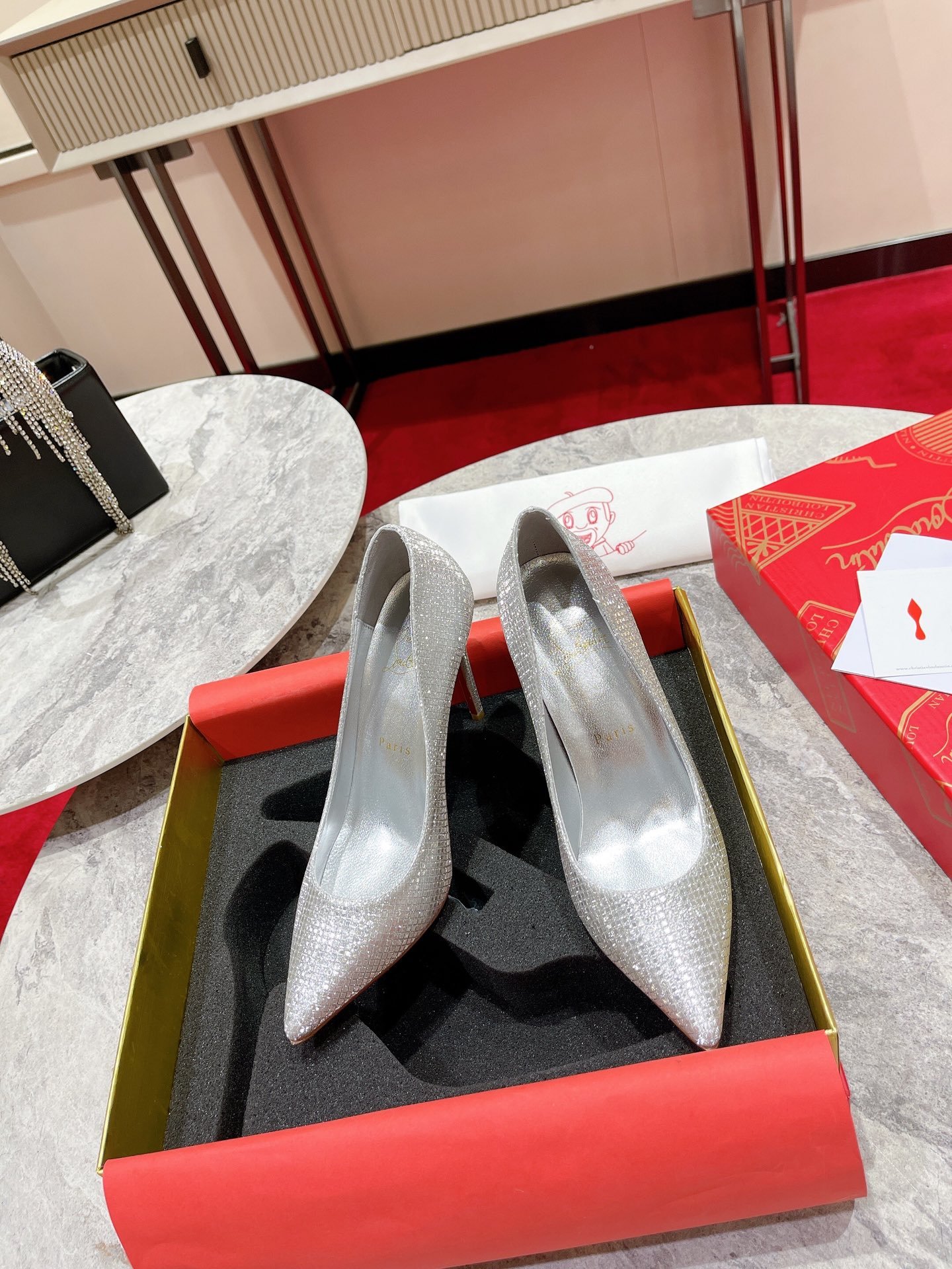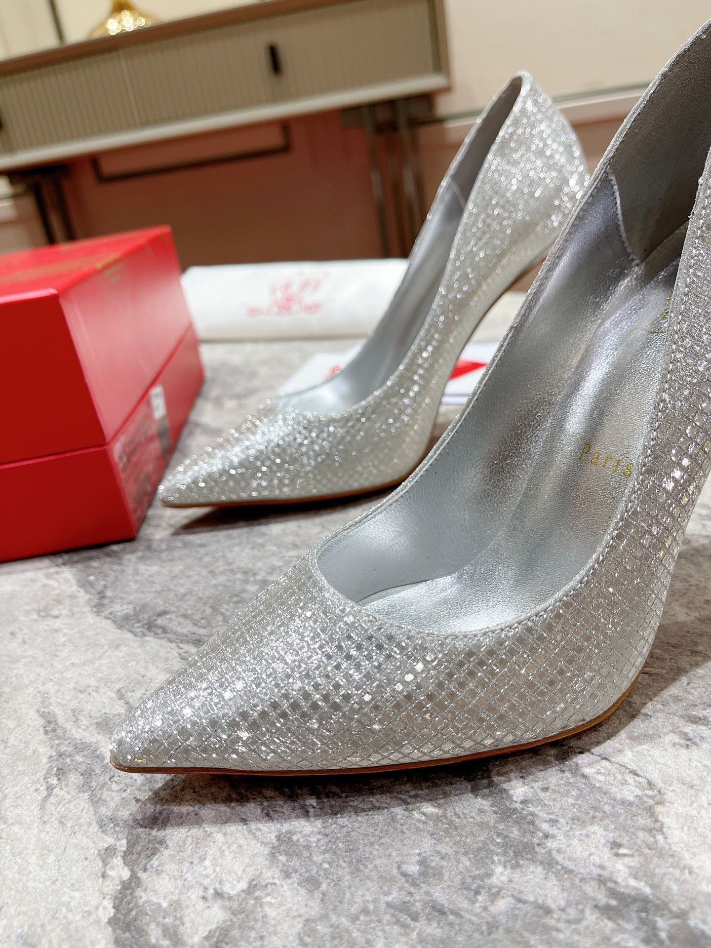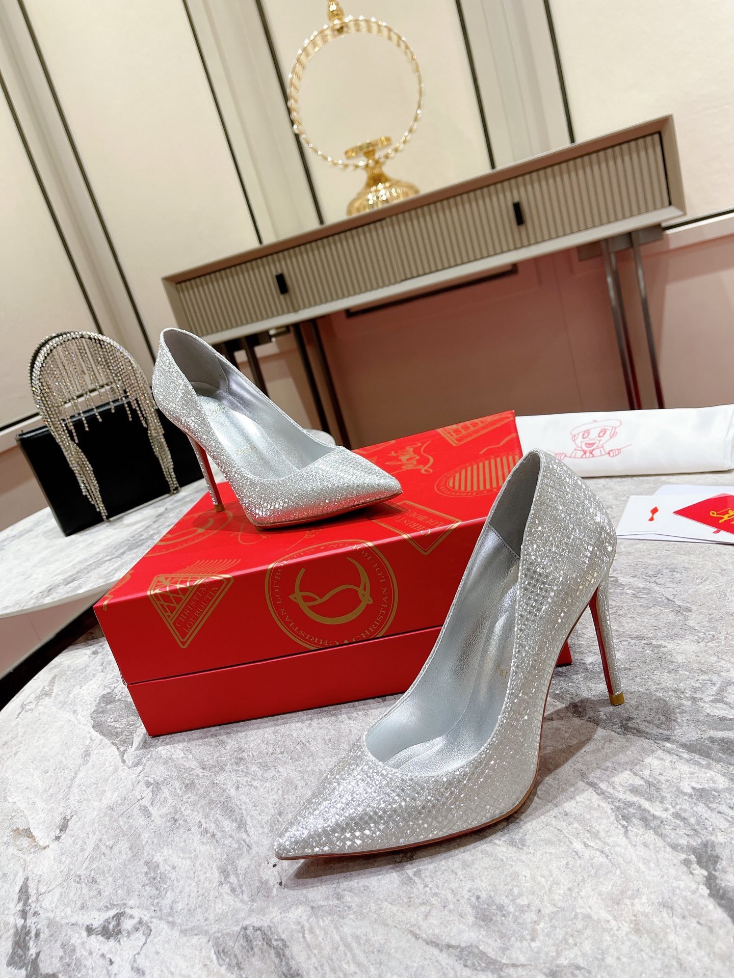 Christian Louboutin Silver Glitter Pointed Toe Red Sole Pump, Flat/6.5/8.5/10/12cm