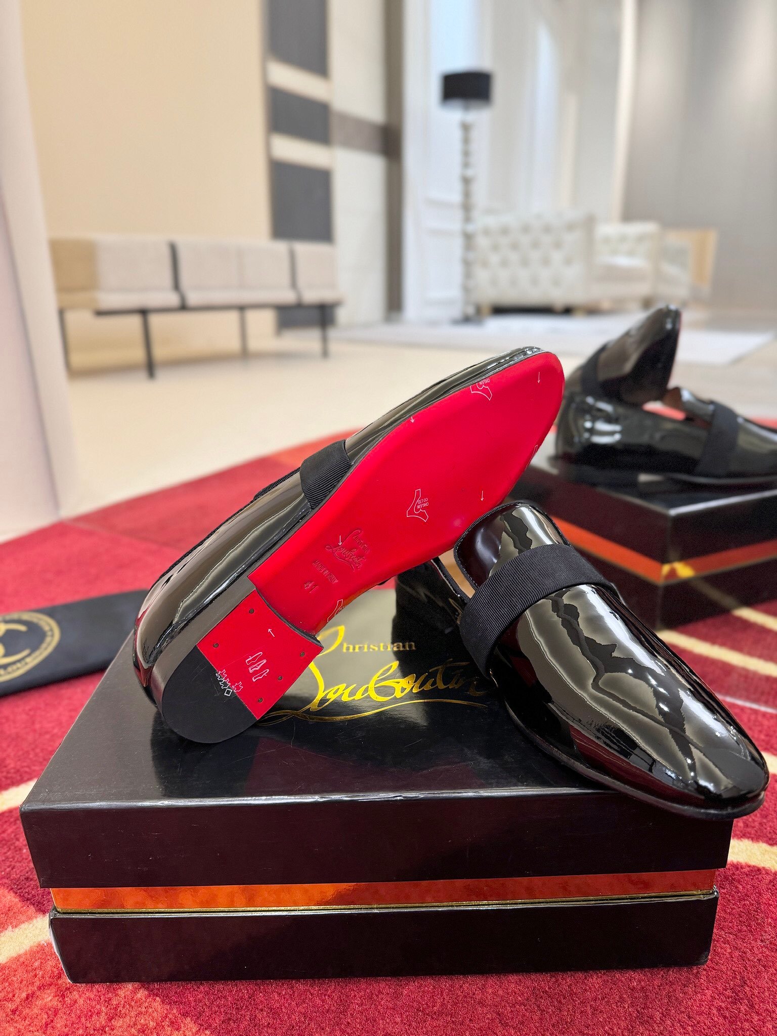 • Material: Black velvet with metallic monogram embroidery, grosgrain strap, and iconic red lacquered sole