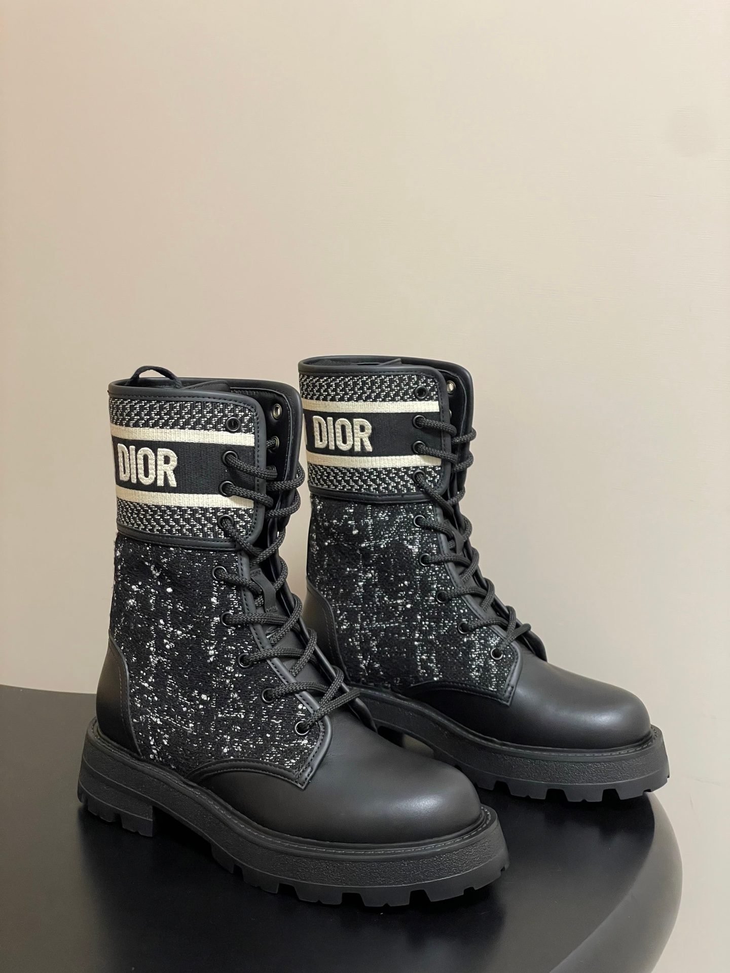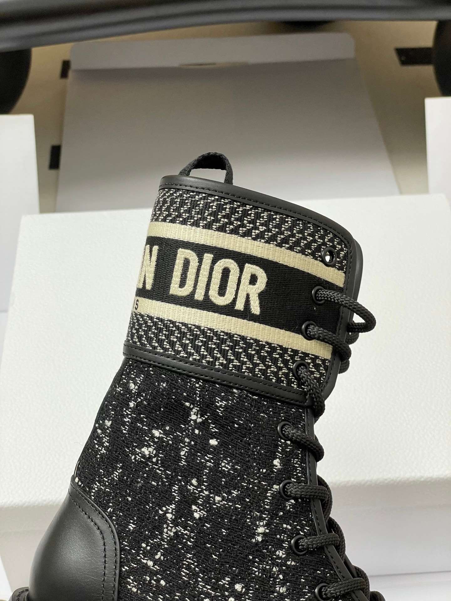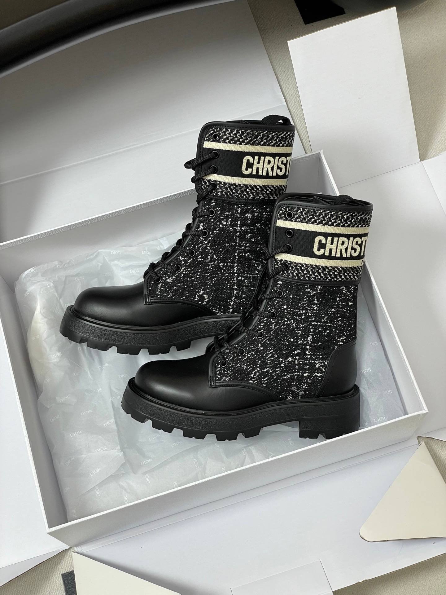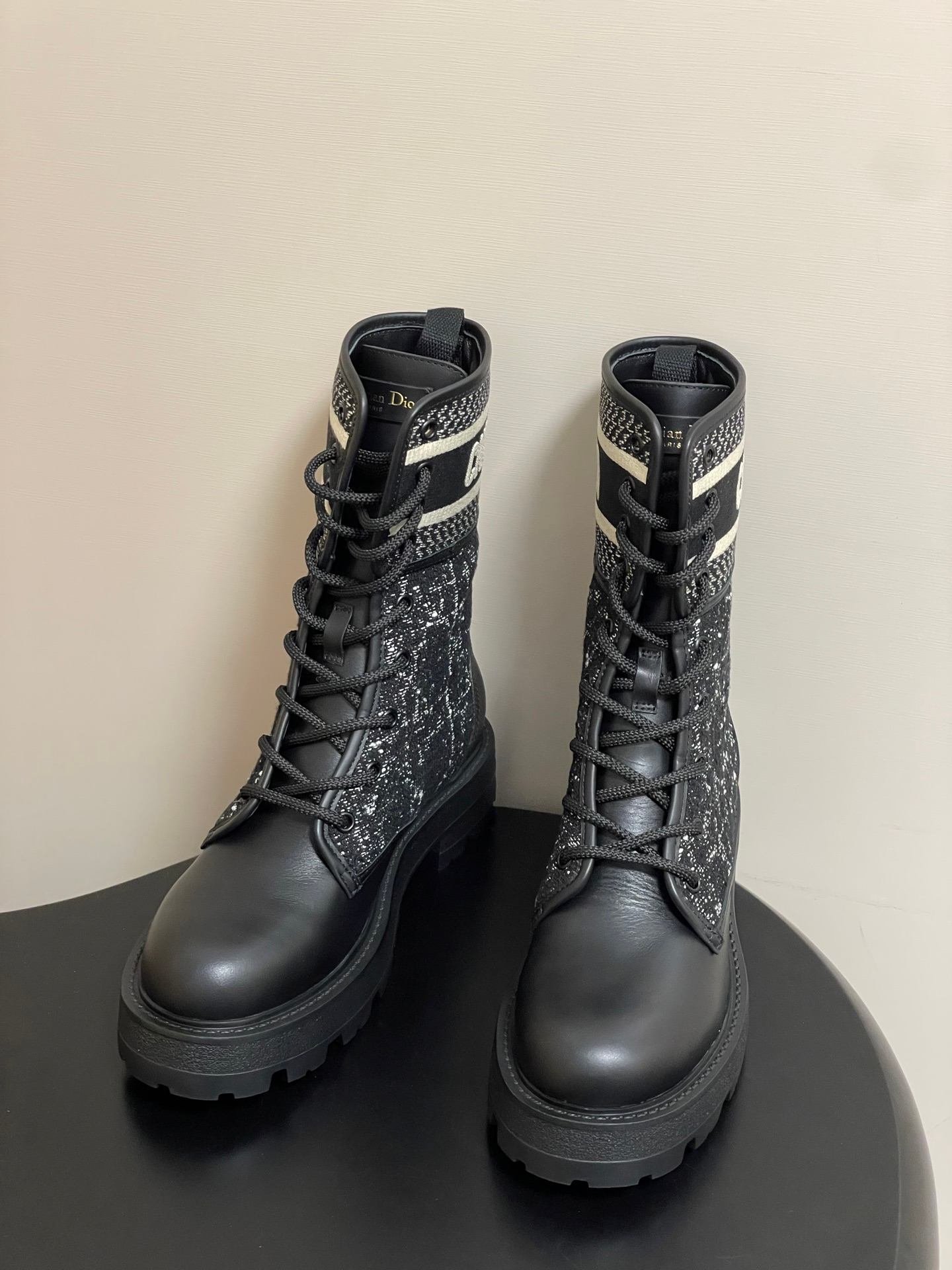 Dior D-Major Lace-Up Combat Boot With Logo Band And Tweed DetailDior D-Major Lace-Up Combat Boot With Logo Band And Tweed Detail