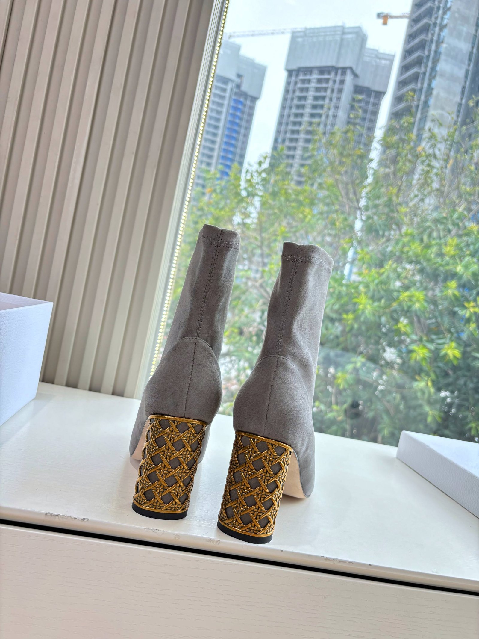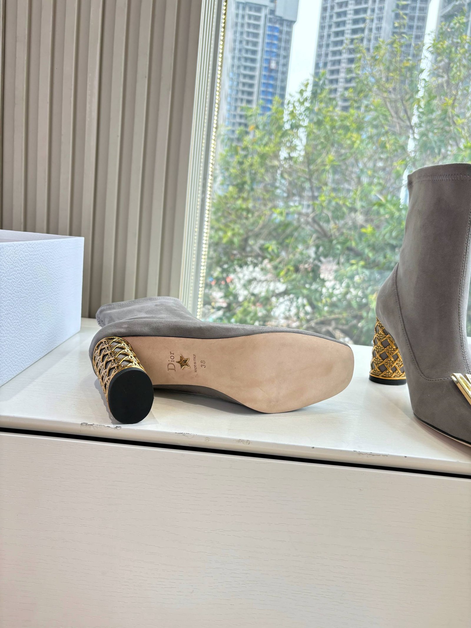 • Material: Black stretch suede with gold “Miss Dior” plaque and ornate gold heel detail