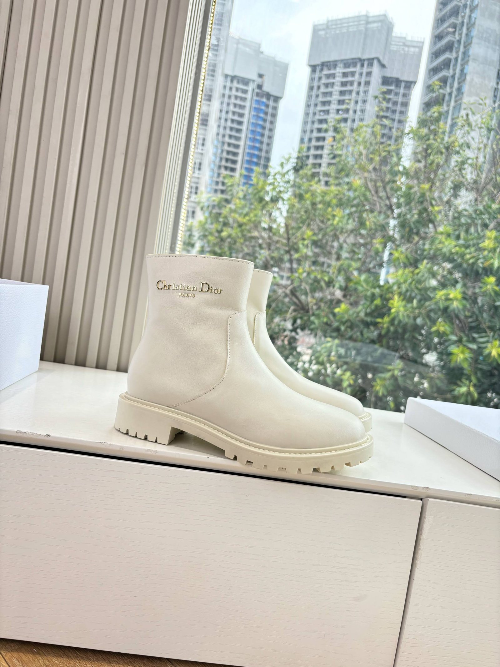 • Material: White leather with chunky lug sole and side zipper detail