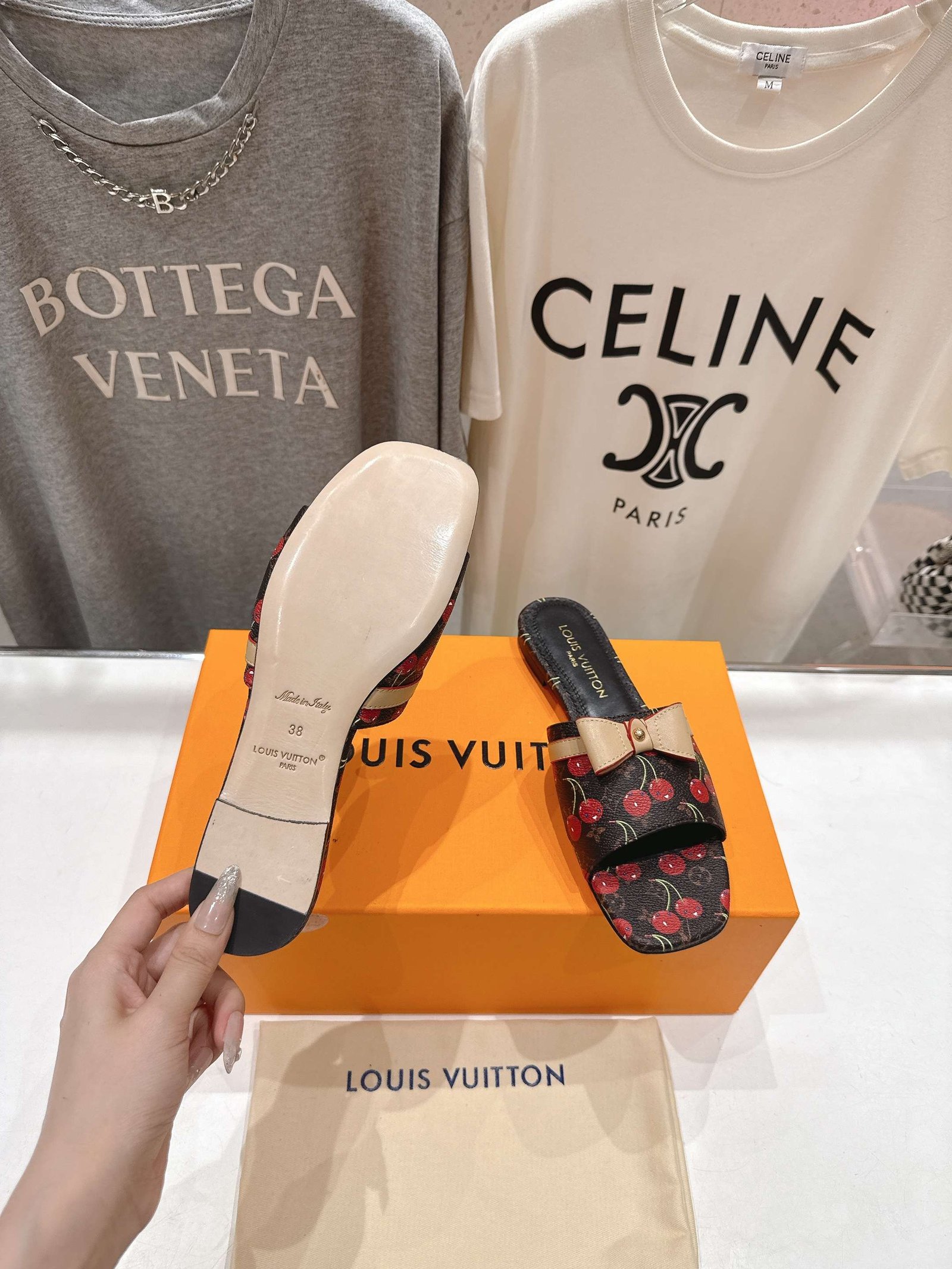 • Material: Brown monogram canvas with cherry print, beige leather bow, flat sole