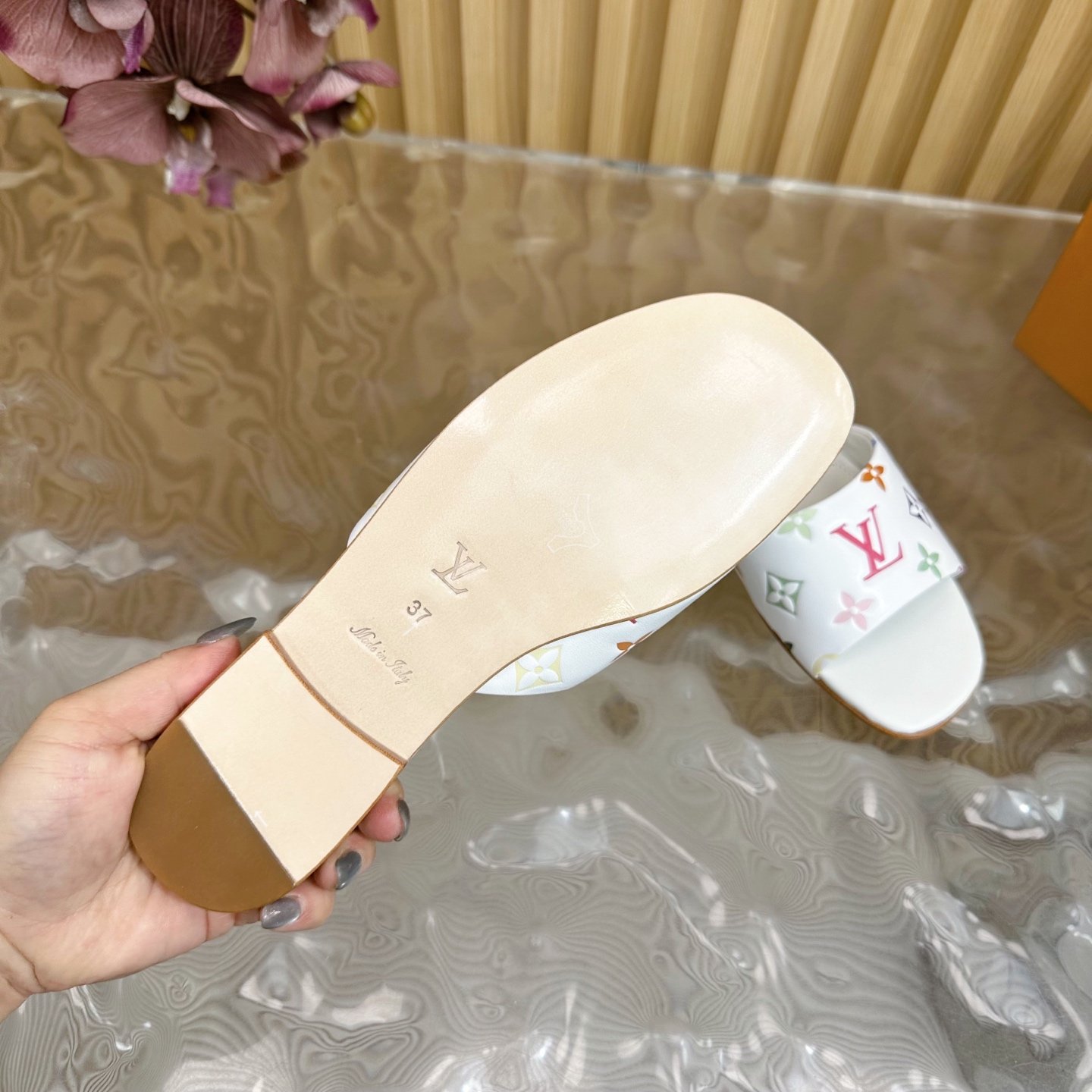 - Material: White leather with multicolor monogram print, square toe, flat sole