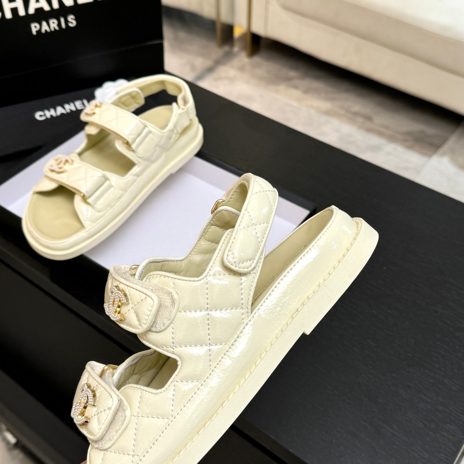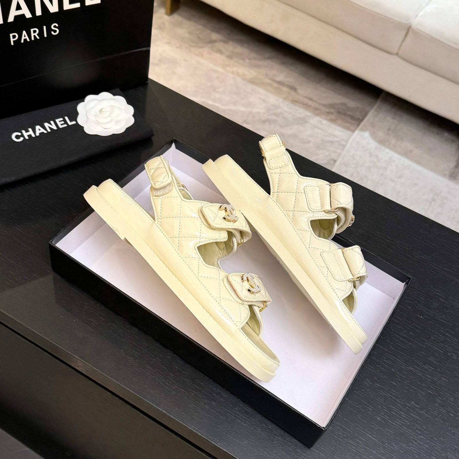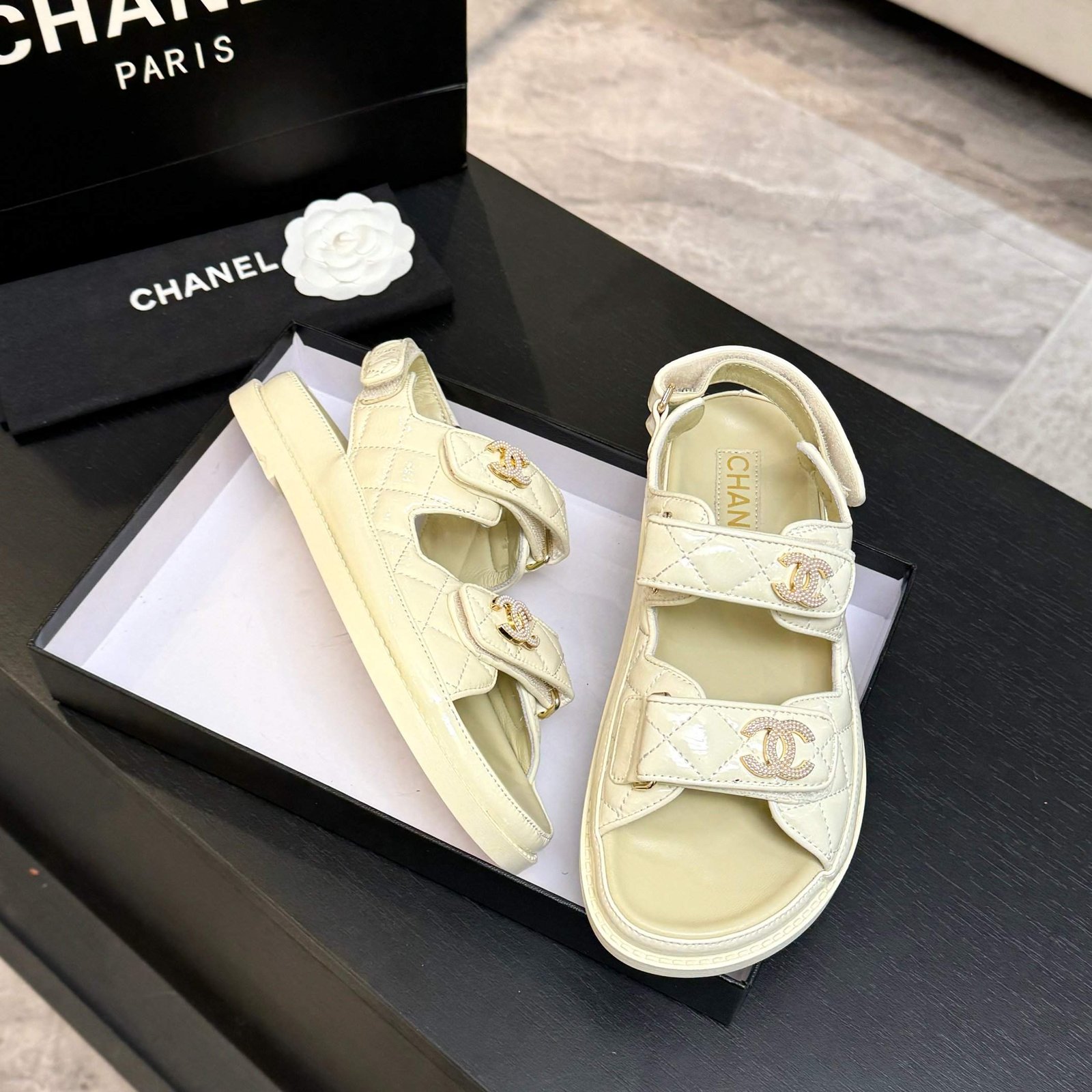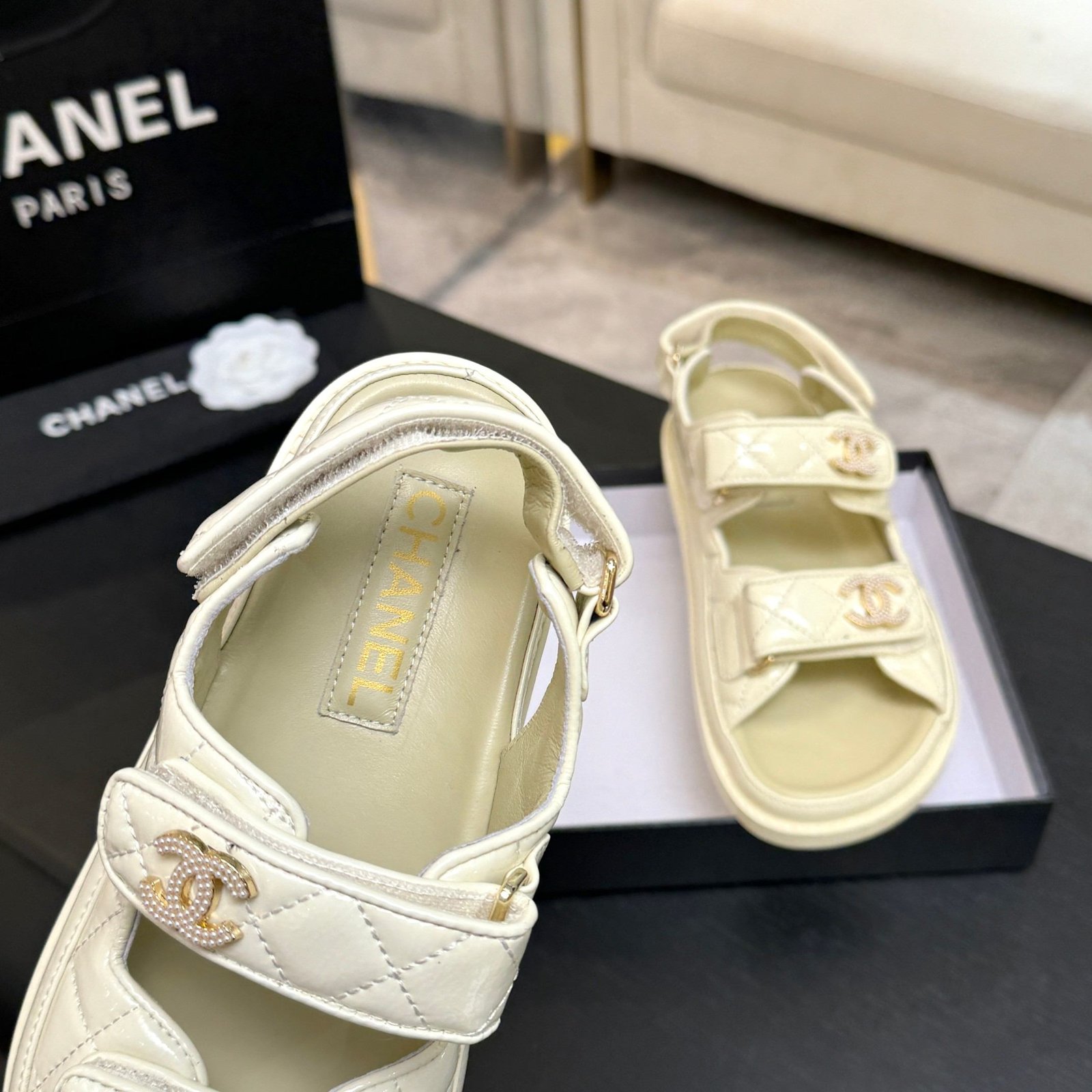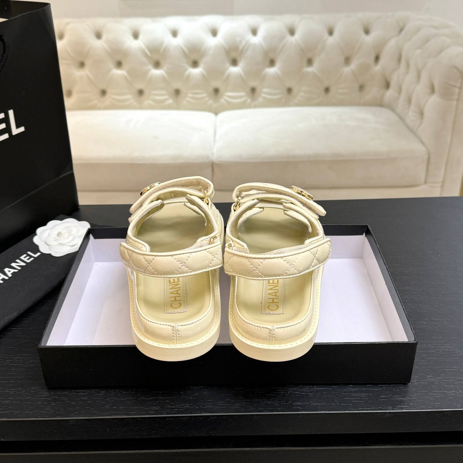 Quilted Leather CC Logo Velcro Flat Sandals