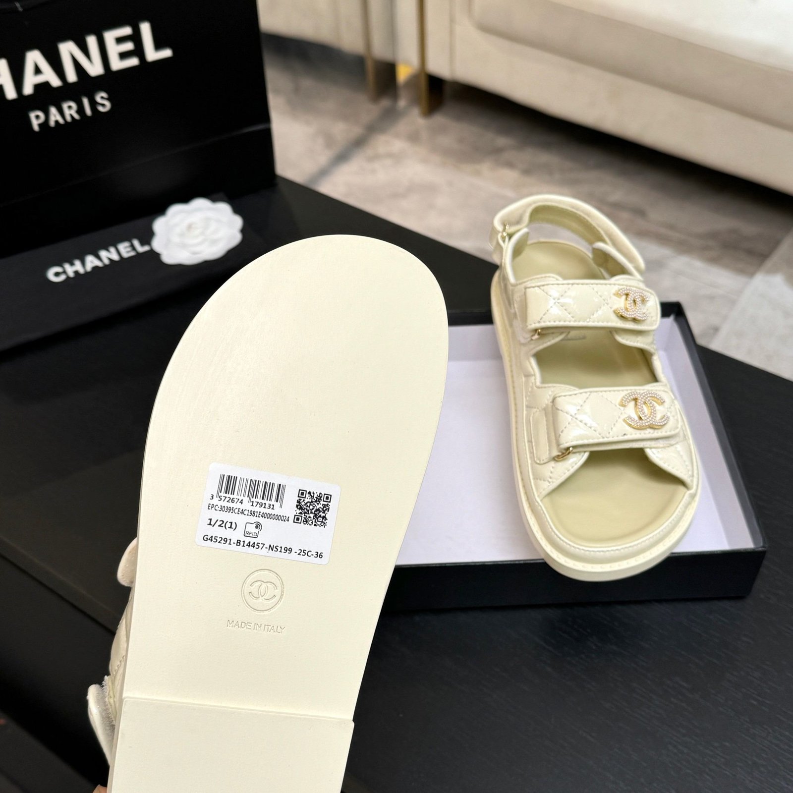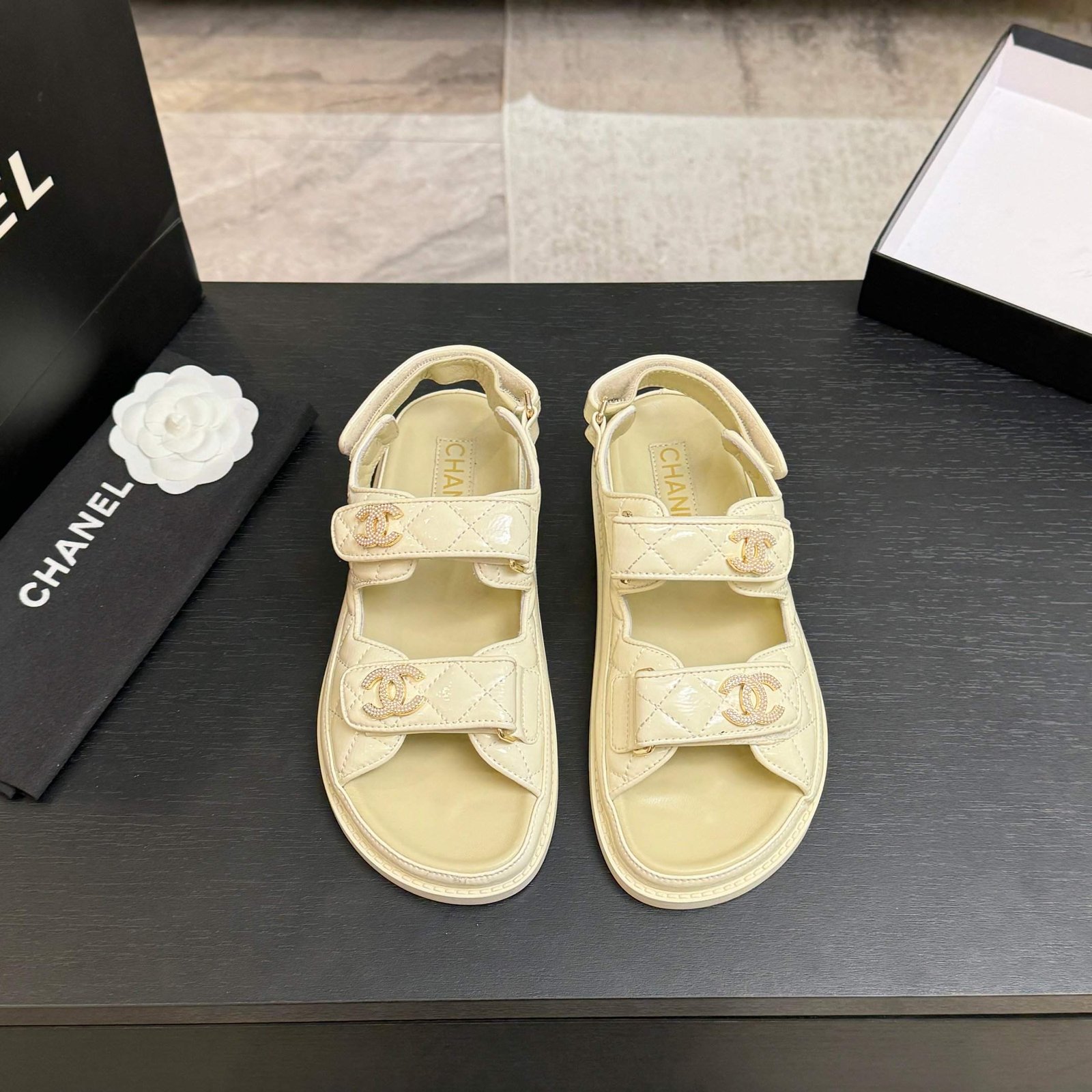 • Series: Quilted Leather CC Logo Flat Sandal Collection
