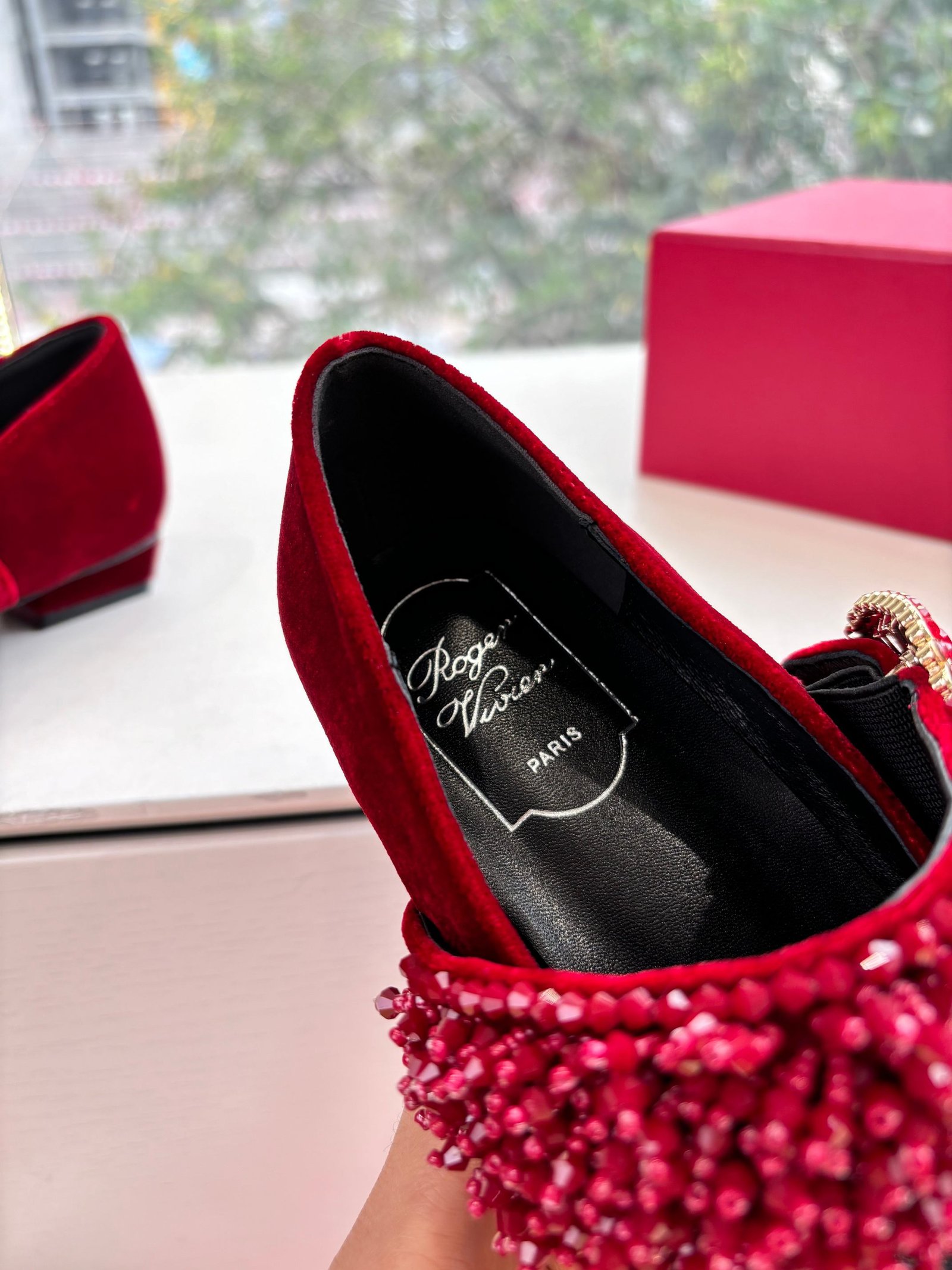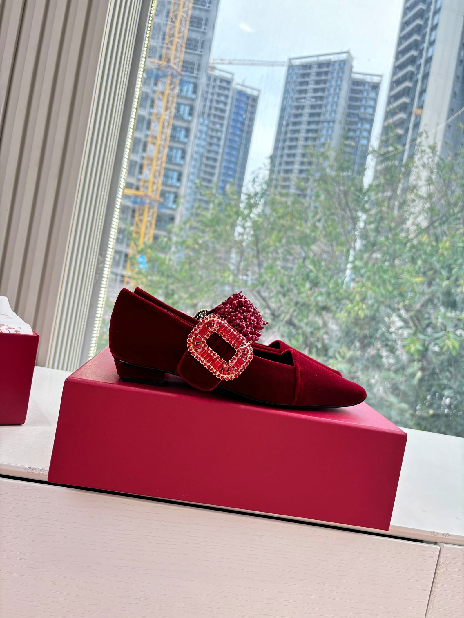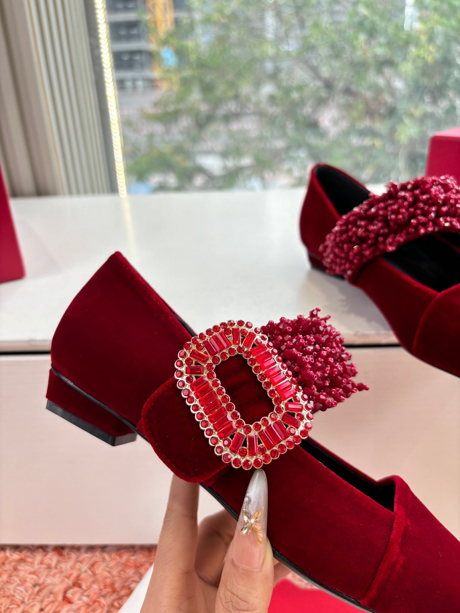 - Material: Burgundy velvet with beaded strap and crystal buckle detail