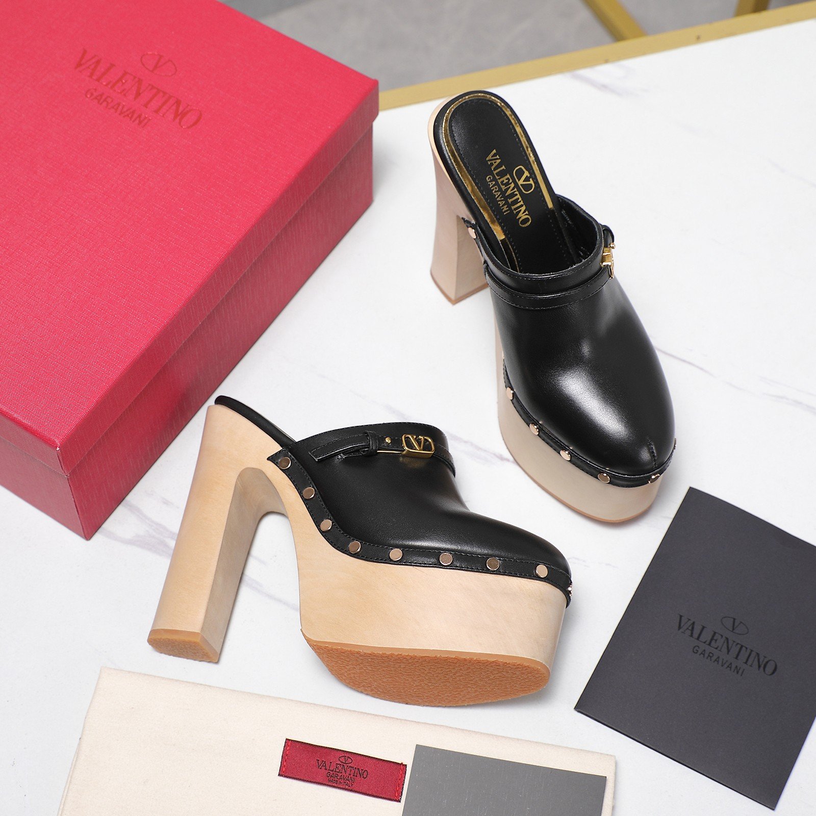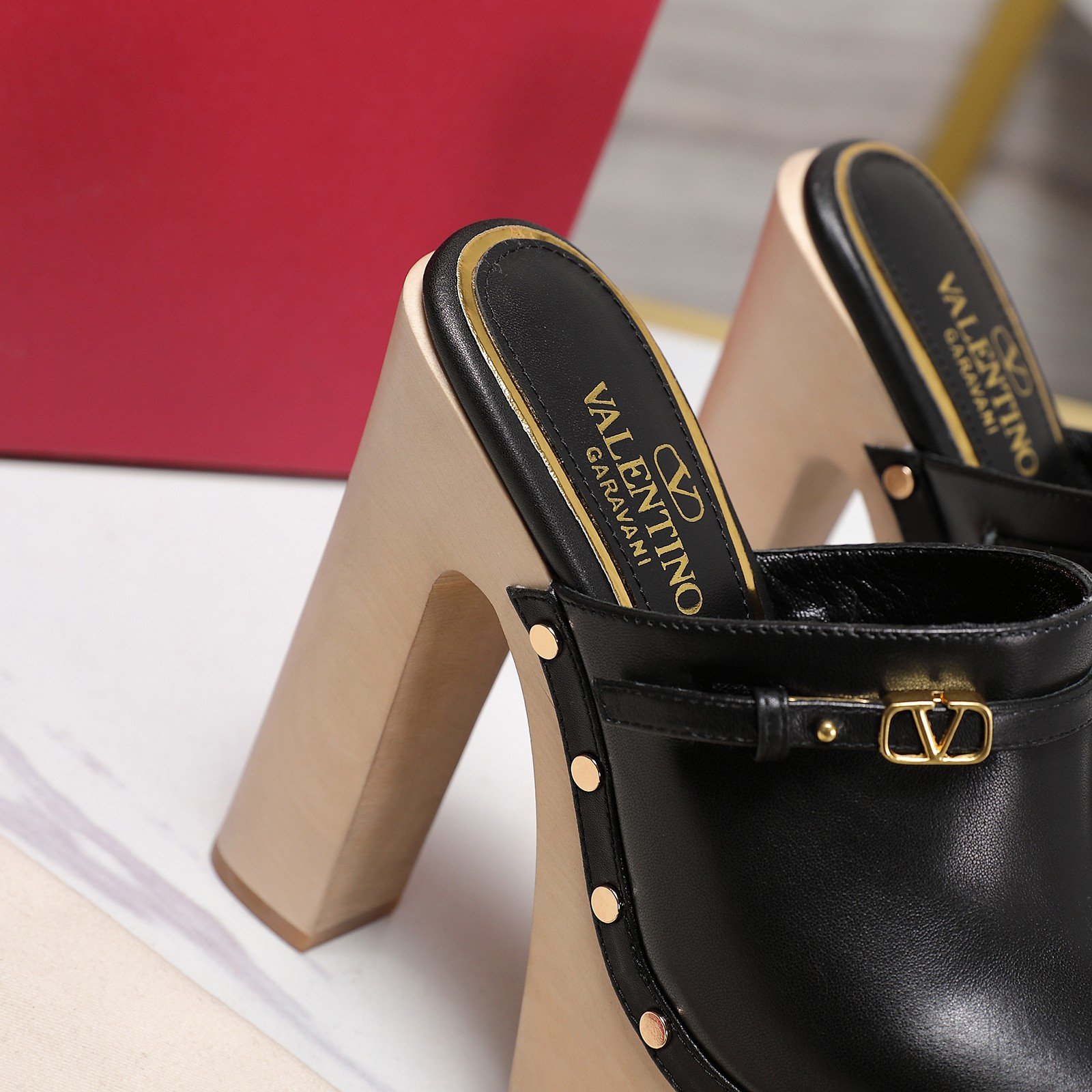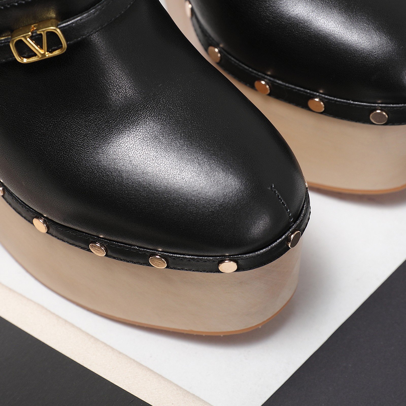 - Material: Black leather with light wood platform and heel, gold-tone VLogo buckle, and metal stud embellishments