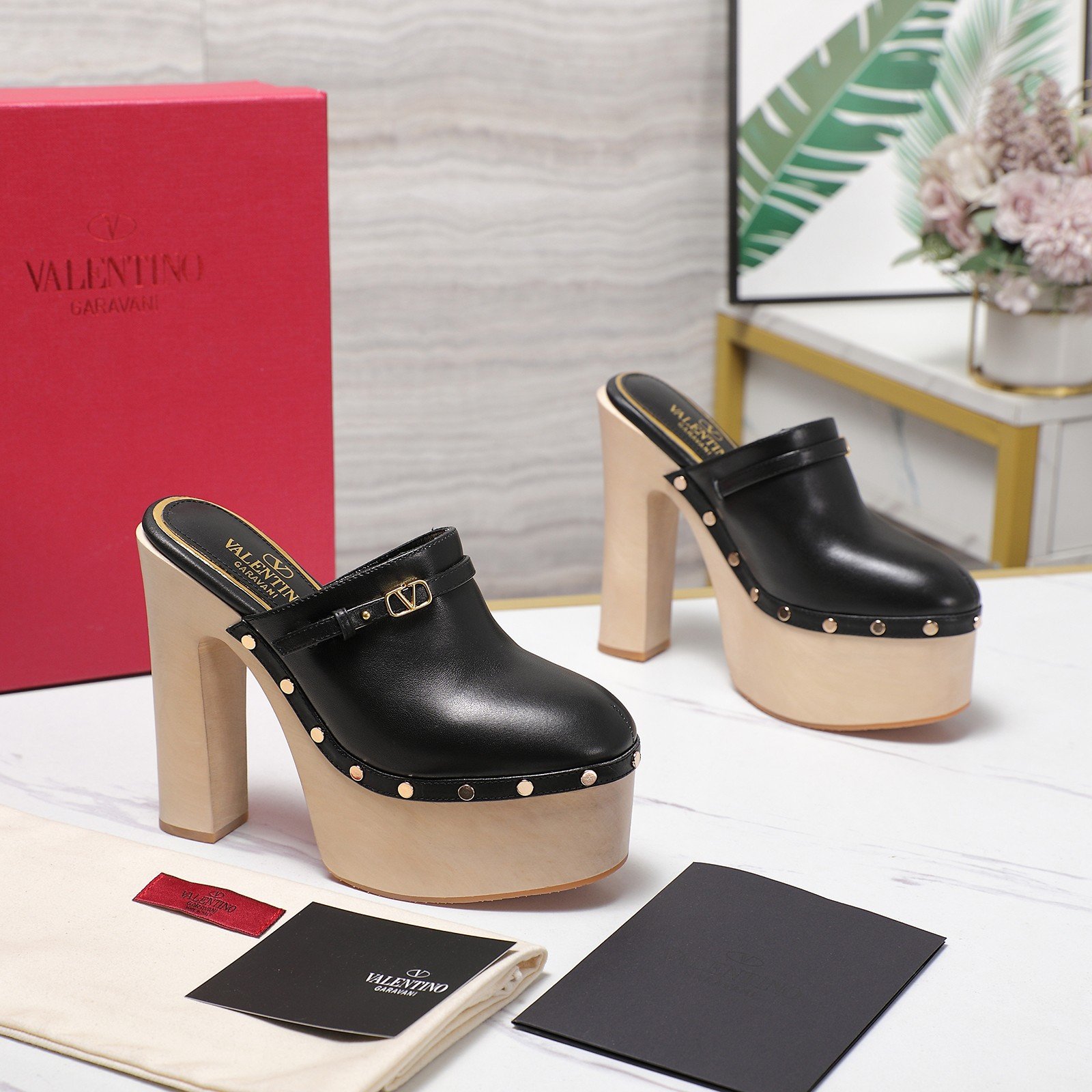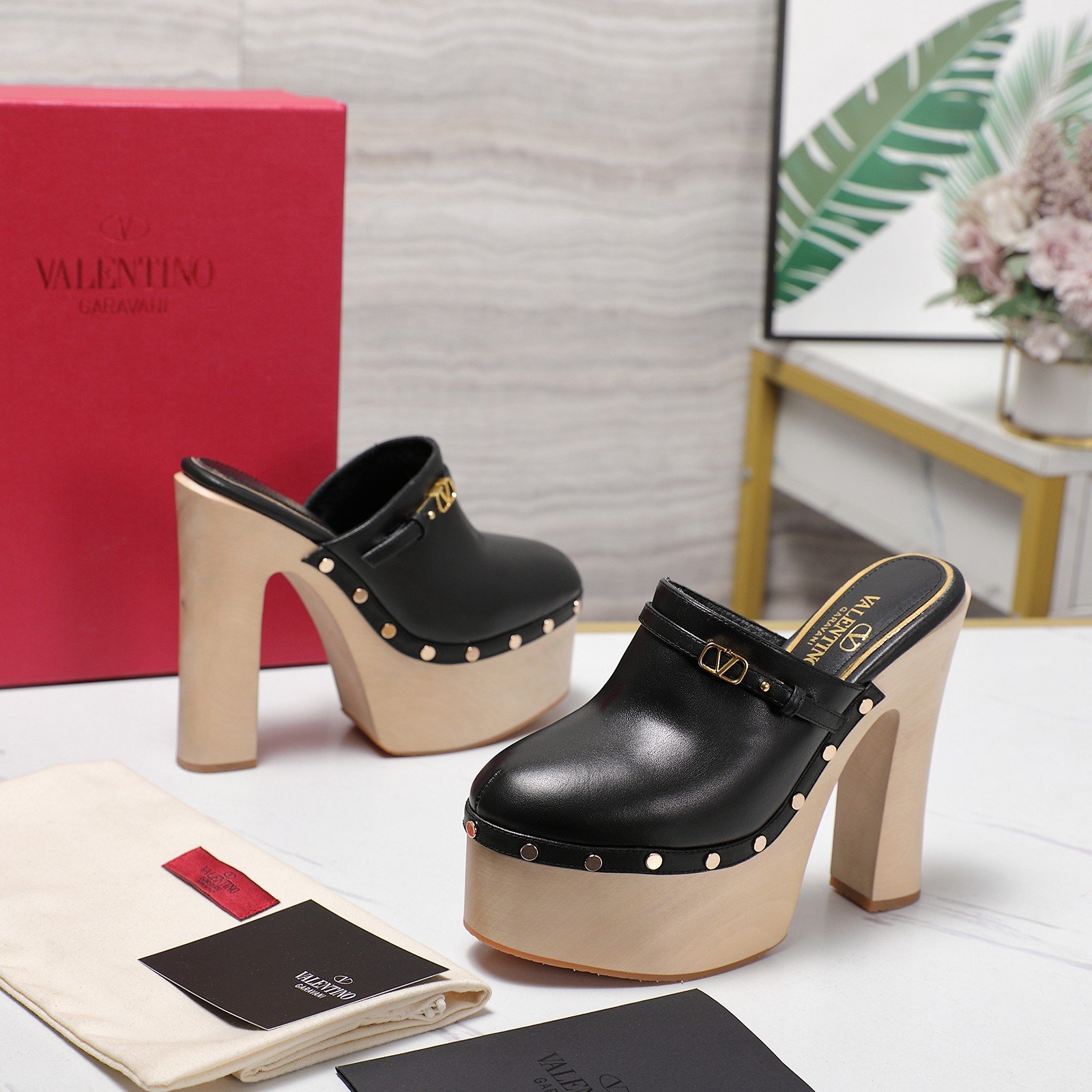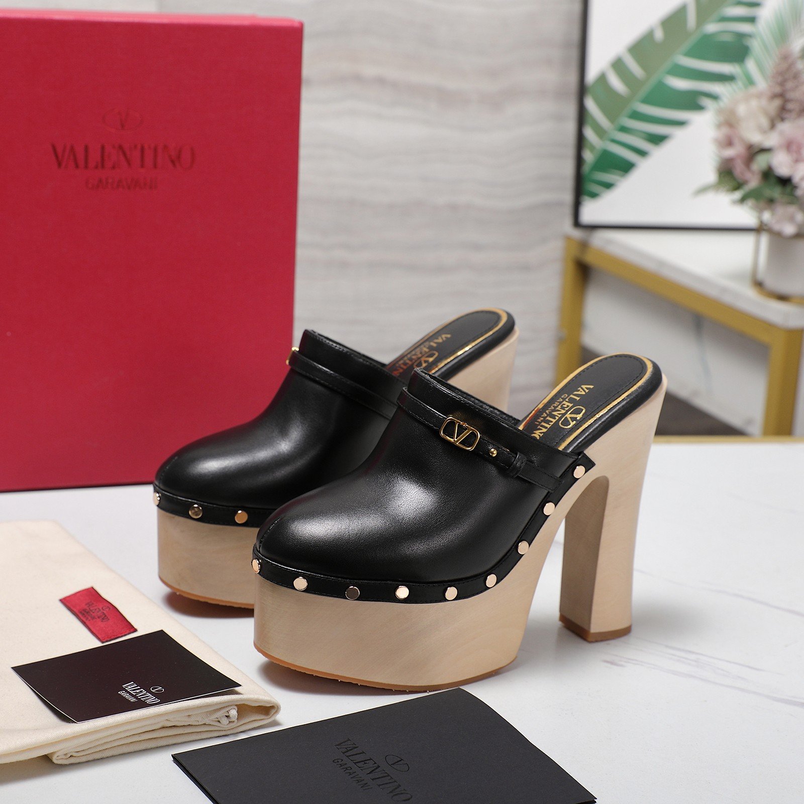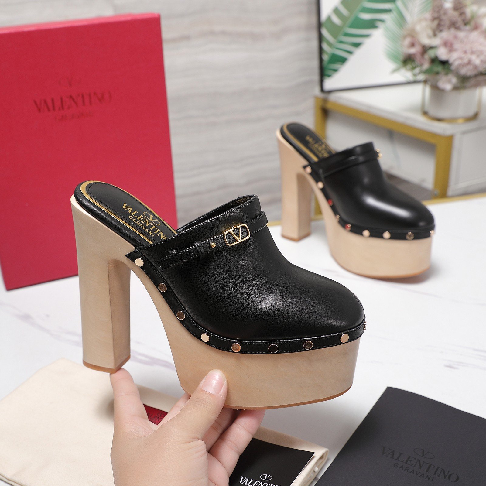 - Material: Black leather with light wood platform and heel, gold-tone VLogo buckle, and metal stud embellishments